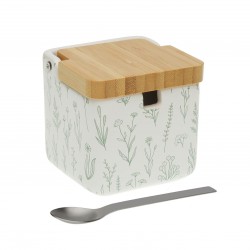 ZUCCHERIERA TULIPANI BAMBOO Referencia: 22110078 Medidas: 8x8x8 cm. Material: Bambù Dolomite Porcellana Packaging: SCATOLA MARRONE Info: Dolomite sugar jar with bamboo lid Porcelain spoon included