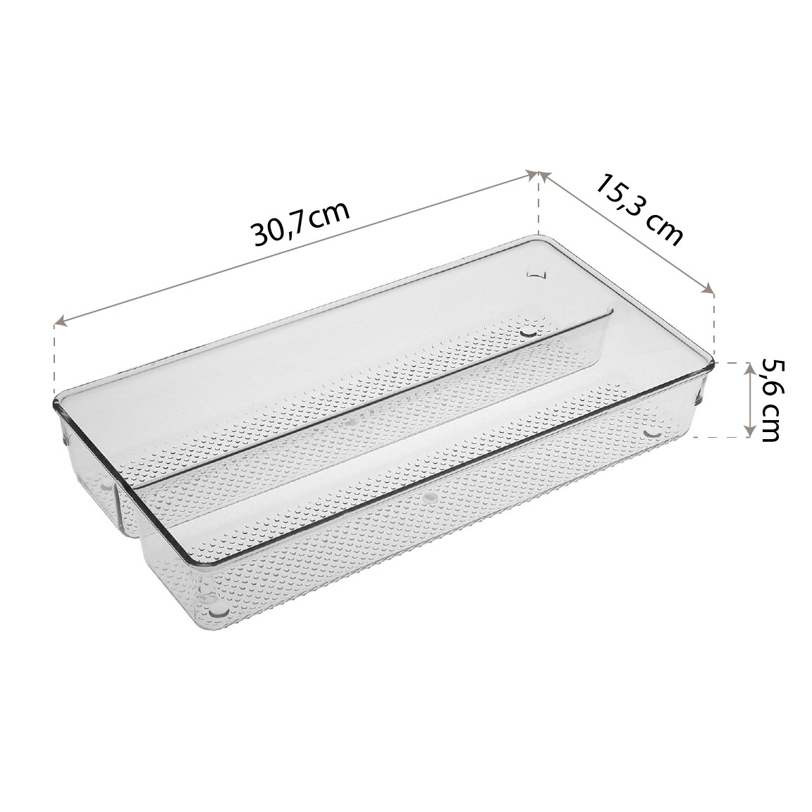Realizzato in plastica trasparente, questo contenitore misura 5,8 cm di altezza, 30,7 cm di larghezza e 15,3 cm di lunghezza, rendendolo ideale per frigoriferi, dispense e armadi.