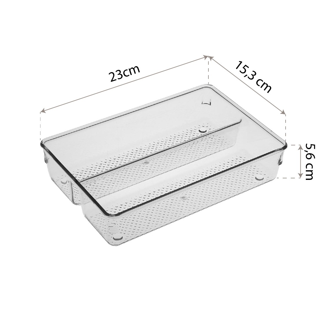 Cassetto organizzatore 2 scomparti allungato, realizzato in plastica trasparente, è la soluzione ideale per ottimizzare lo spazio nel frigorifero e mantenere in ordine alimenti e bevande.