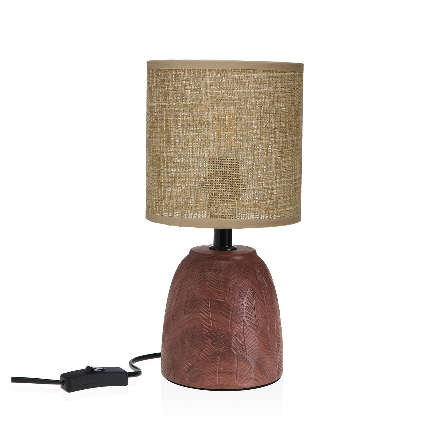 Realizzata in ceramica con una base decorativa nei toni marroni e terracotta, è dotata di un paralume in tessuto che diffonde una luce calda e accogliente.
