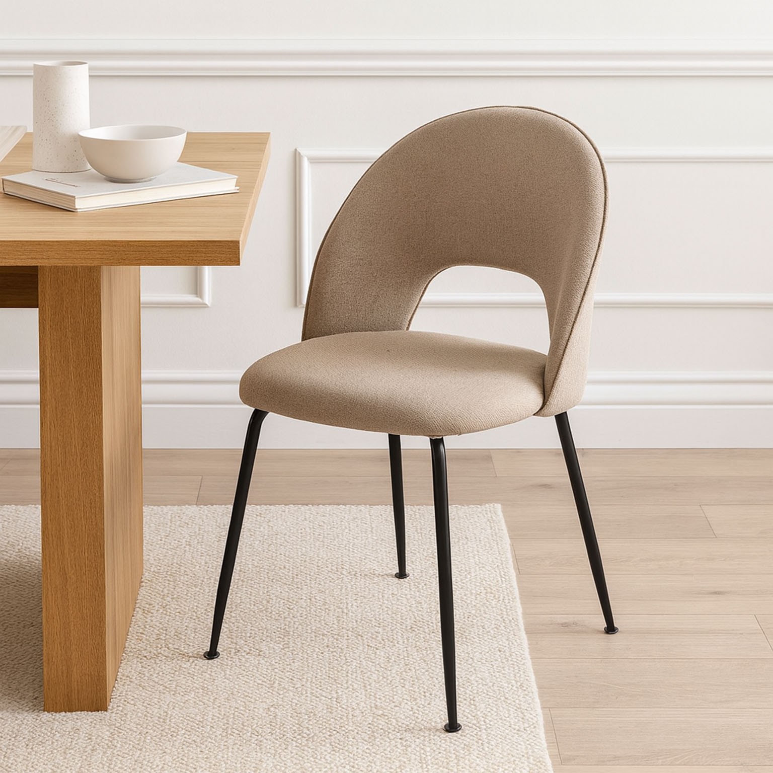 La sedia Riglos beige è un elemento di arredo moderno e versatile, ideale per ambienti come sale da pranzo, cucine e uffici.