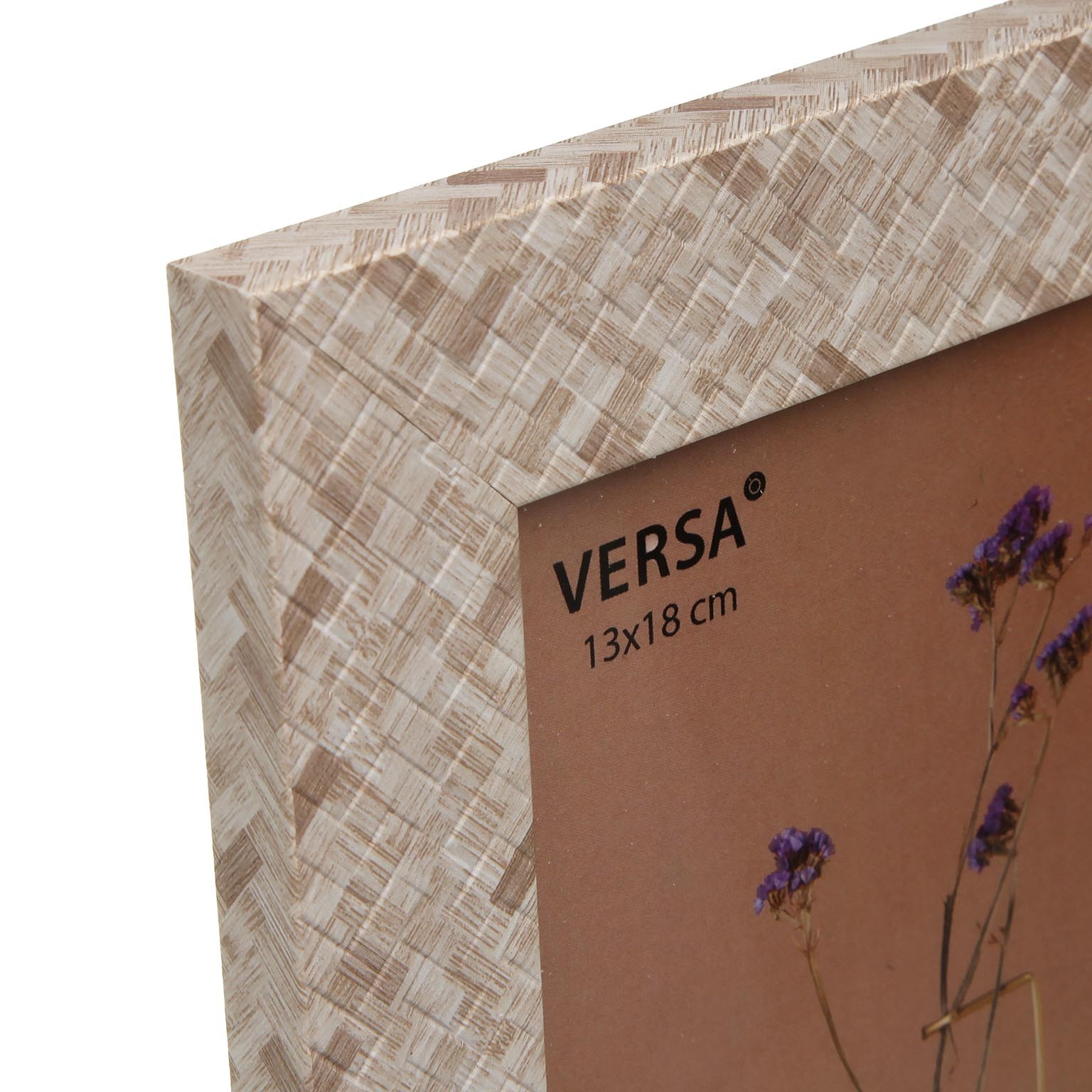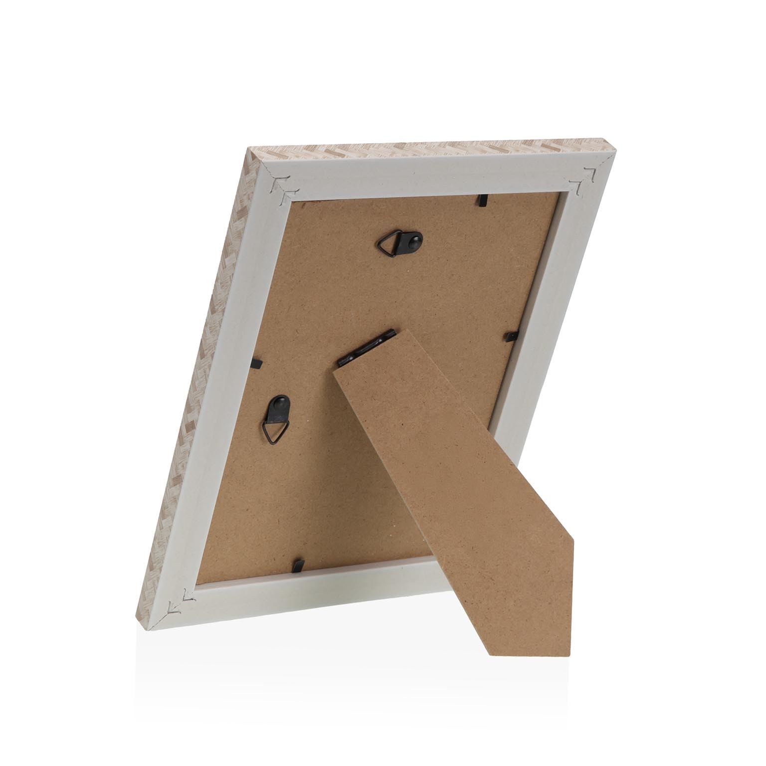 Con dimensioni di 21,6 cm in altezza, 16,6 cm in lunghezza e 1,1 cm in larghezza, questa cornice presenta toni neutri, prevalentemente beige o avorio, con una finitura che richiama motivi intrecciati.