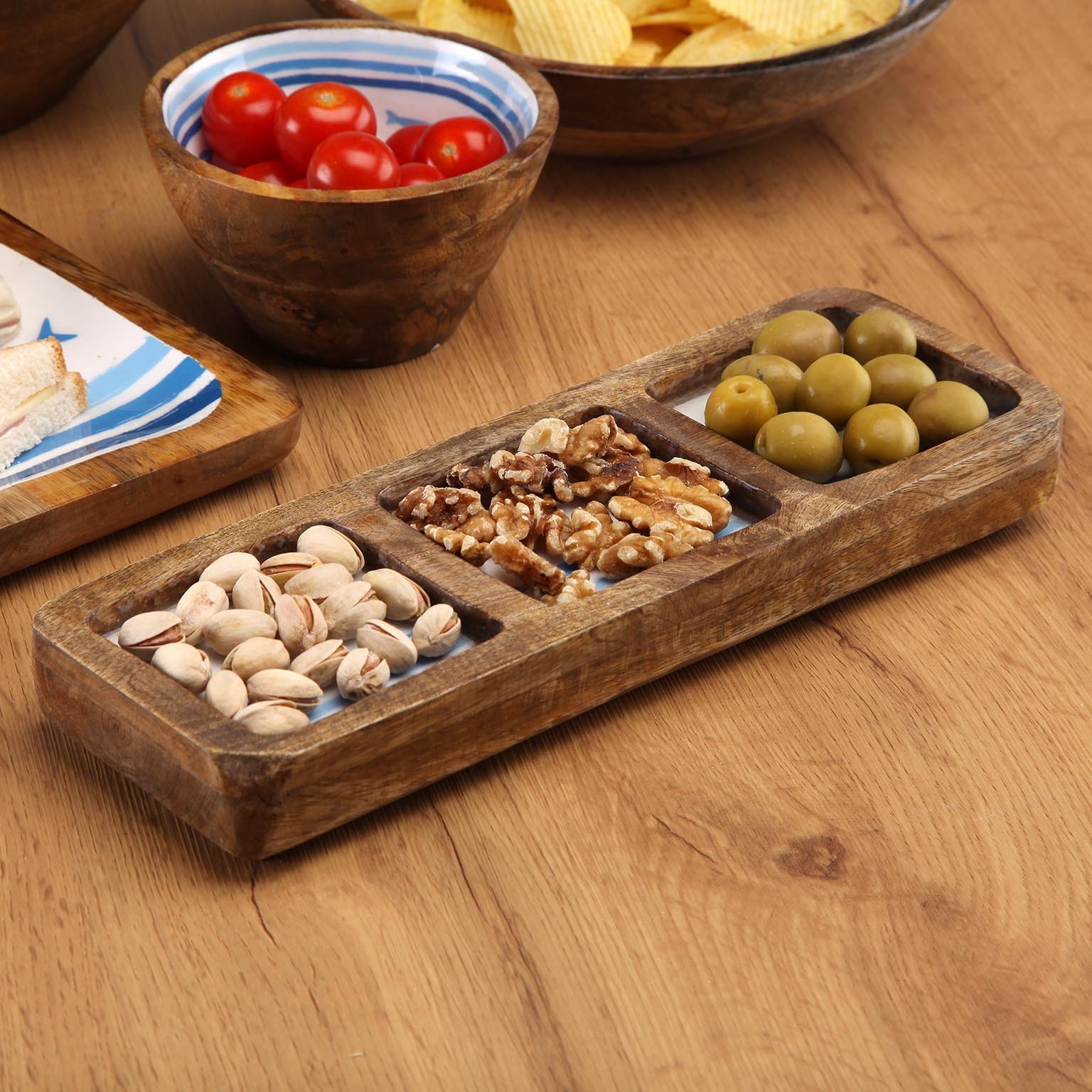 Il piatto tre scomparti Oceanic è un elegante accessorio da portata realizzato in legno di mango, caratterizzato da un design rustico ed etnico.
