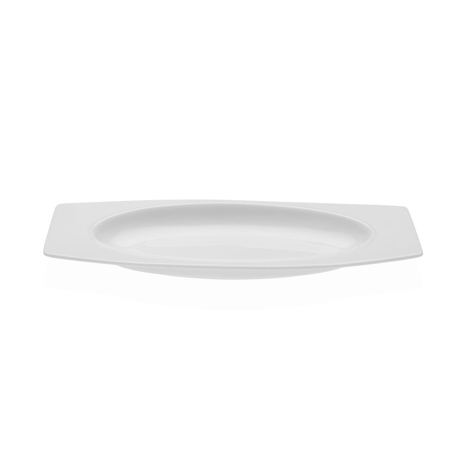 Piatto in porcellana bianca della linea Cocktail, ideale per servire antipasti o sushi.