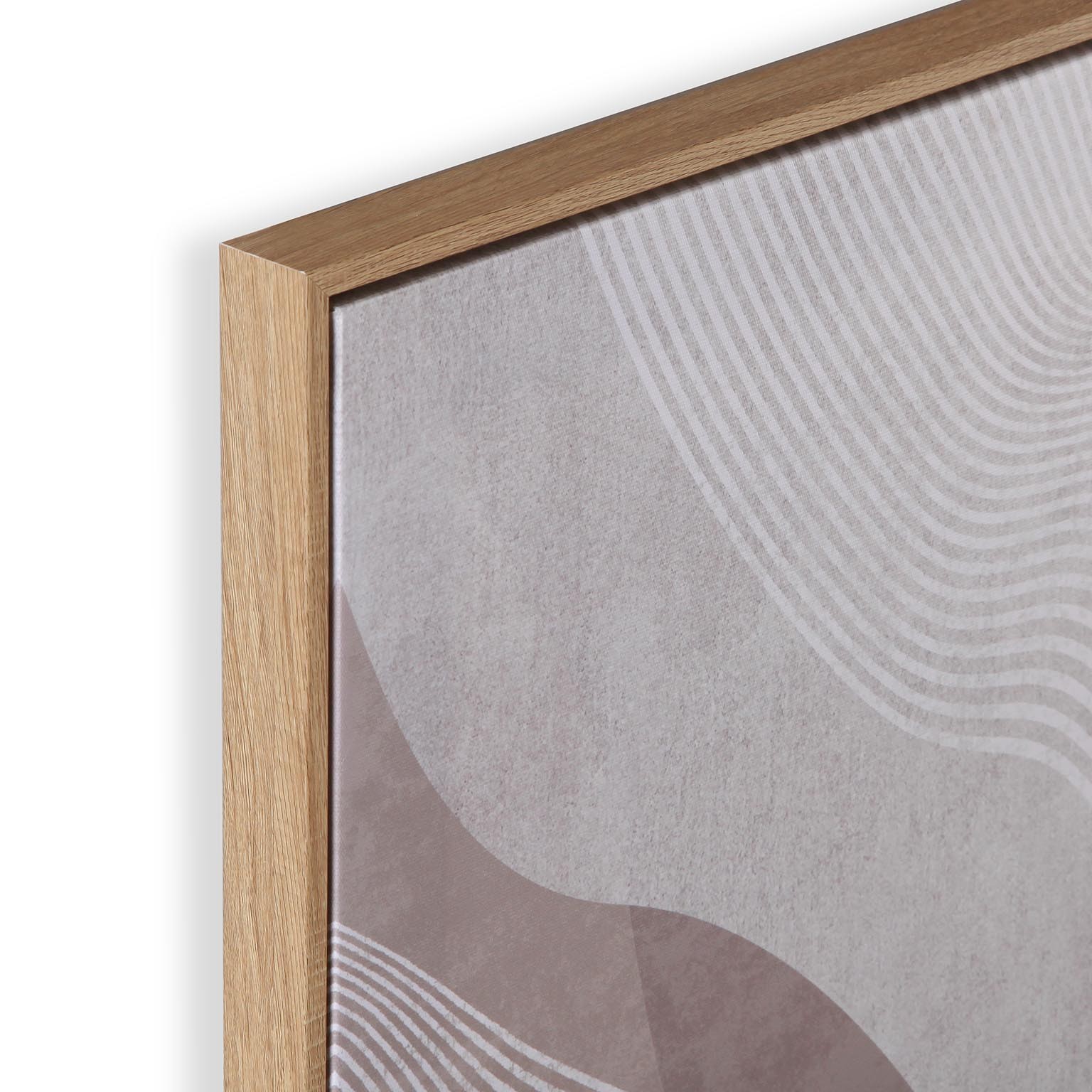 Realizzato in tela, presenta un design moderno caratterizzato da linee fluide e astratte, con tonalità neutre di beige, grigio e bianco.