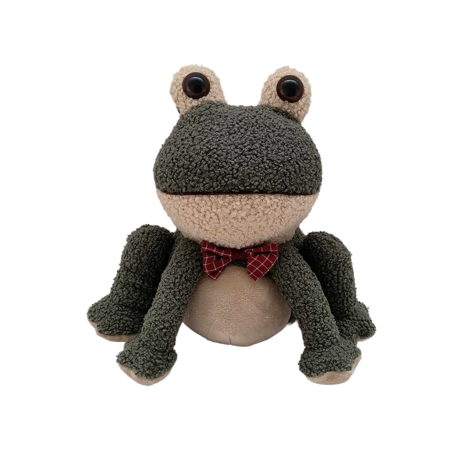 Realizzato in morbido tessuto, con imbottitura interna, presenta un design giocoso e accattivante, caratterizzato da un corpo verde scuro, una base beige e un elegante papillon rosso e bianco.