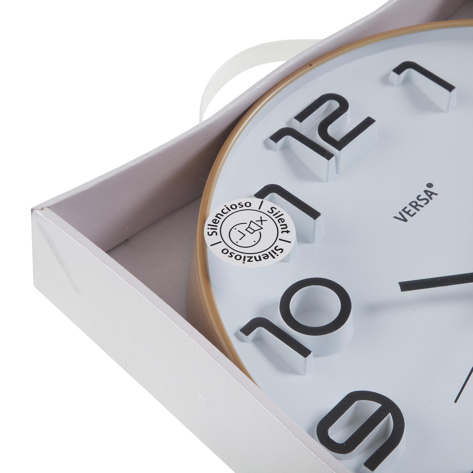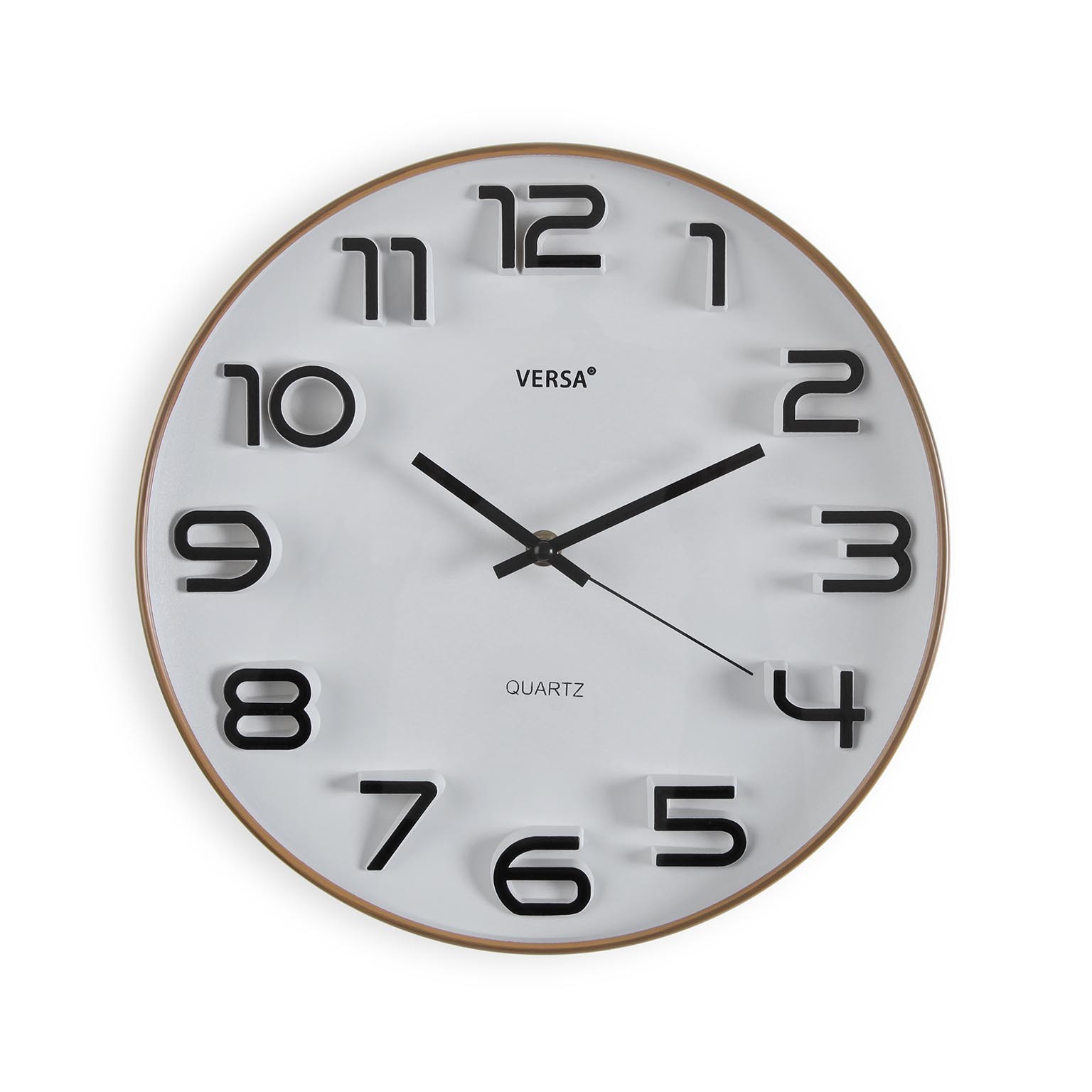 Realizzato in plastica resistente e cristallo, presenta un quadrante bianco con numeri e lancette nere, arricchito da dettagli dorati sulla cornice.
