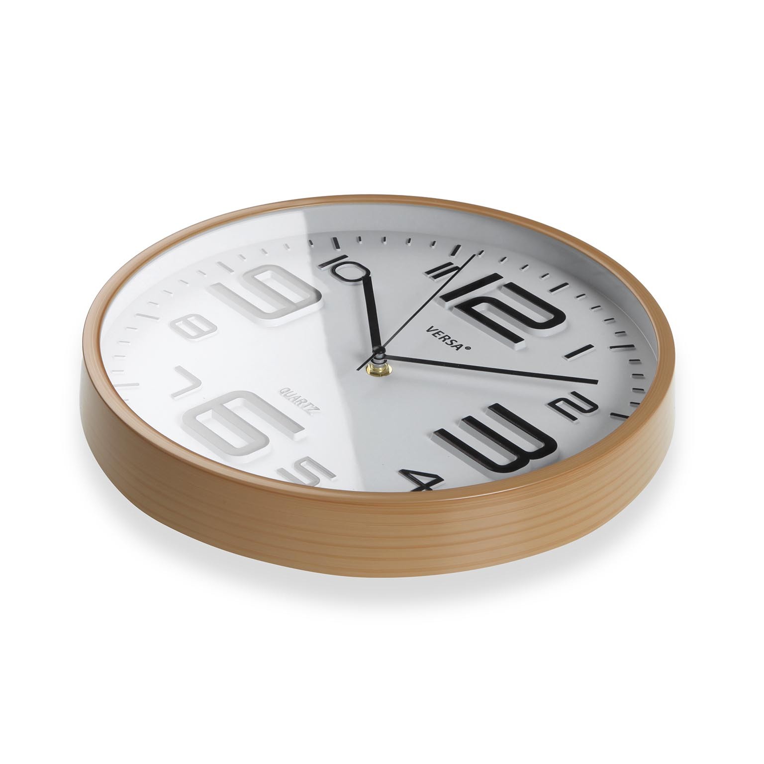 Realizzato in plastica con un quadrante in cristallo, presenta un design moderno e minimalista, con numeri neri ben visibili su uno sfondo bianco e dettagli in legno chiaro.