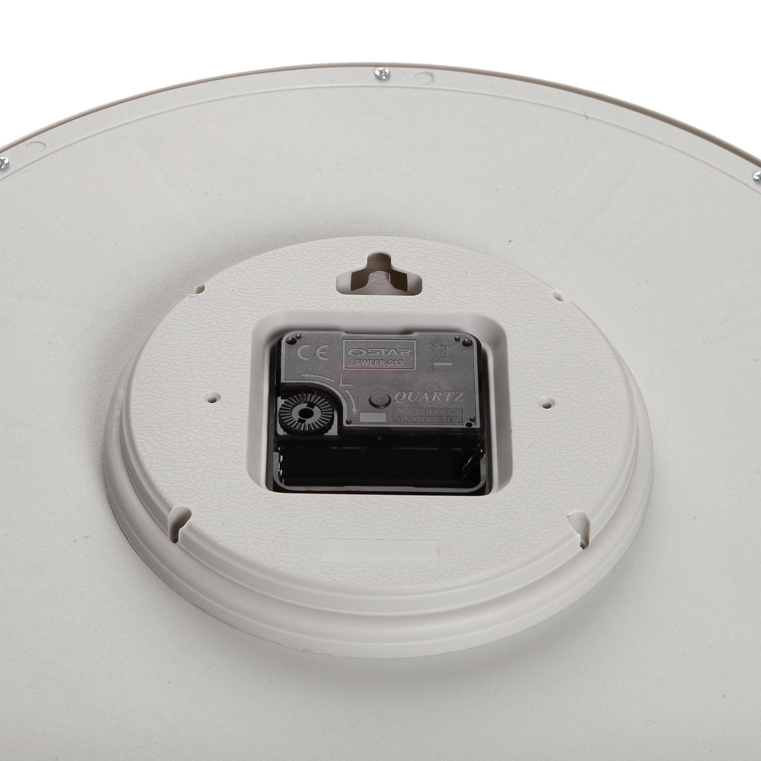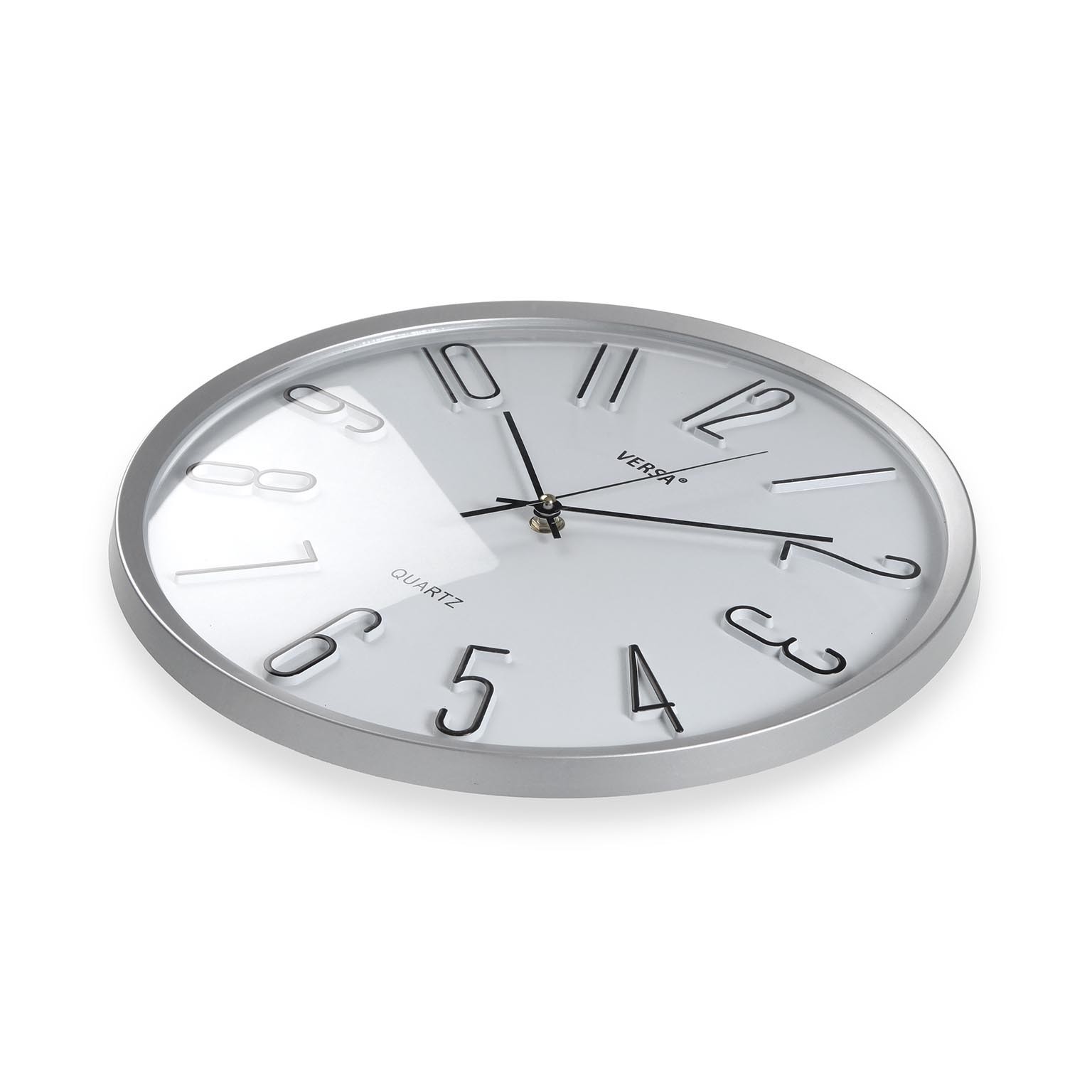Orologio da parete bianco con un diametro di 33 cm, realizzato in plastica con un elegante quadrante in vetro.