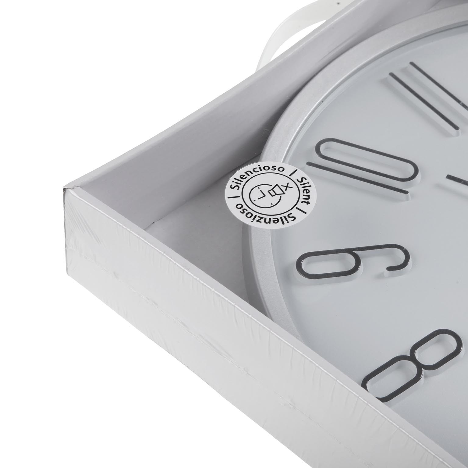I numeri e le lancette in nero, insieme al bordo argentato, creano un contrasto raffinato su pareti chiare.