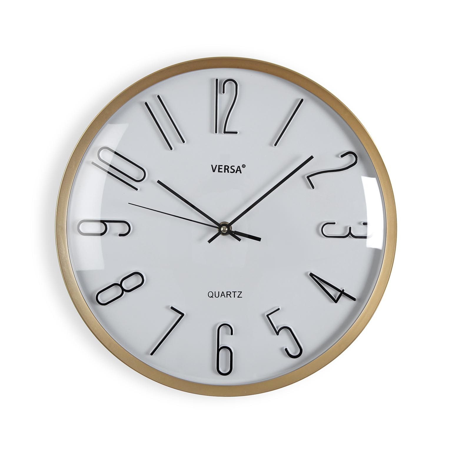 Realizzato in plastica, presenta un quadrante bianco con dettagli in oro per cornice e lancette, conferendo un aspetto elegante e pulito.