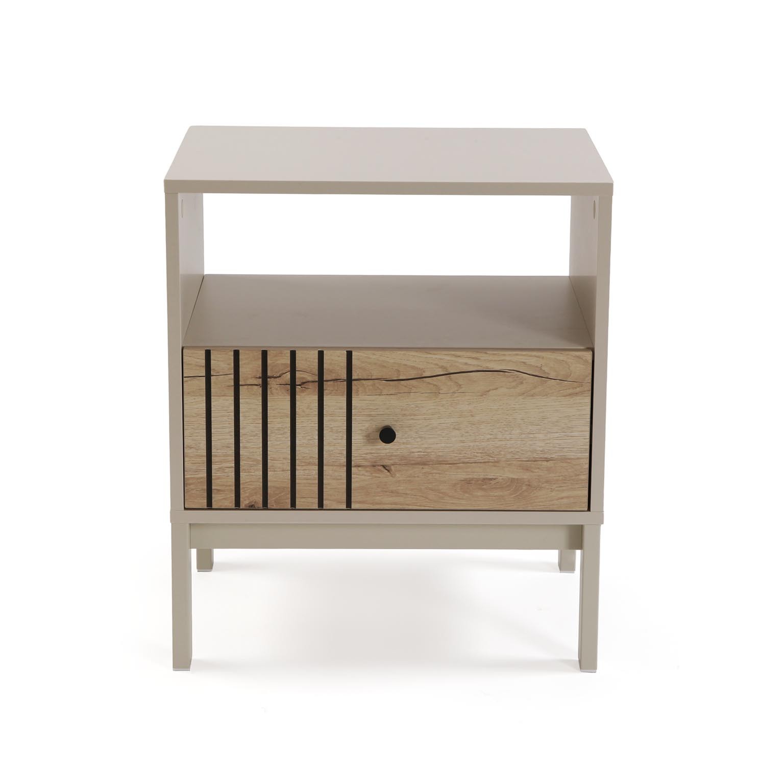 Realizzato in legno MDF e melamina, presenta una struttura robusta con una finitura in legno chiaro per il cassetto, che conferisce un tocco di calore.