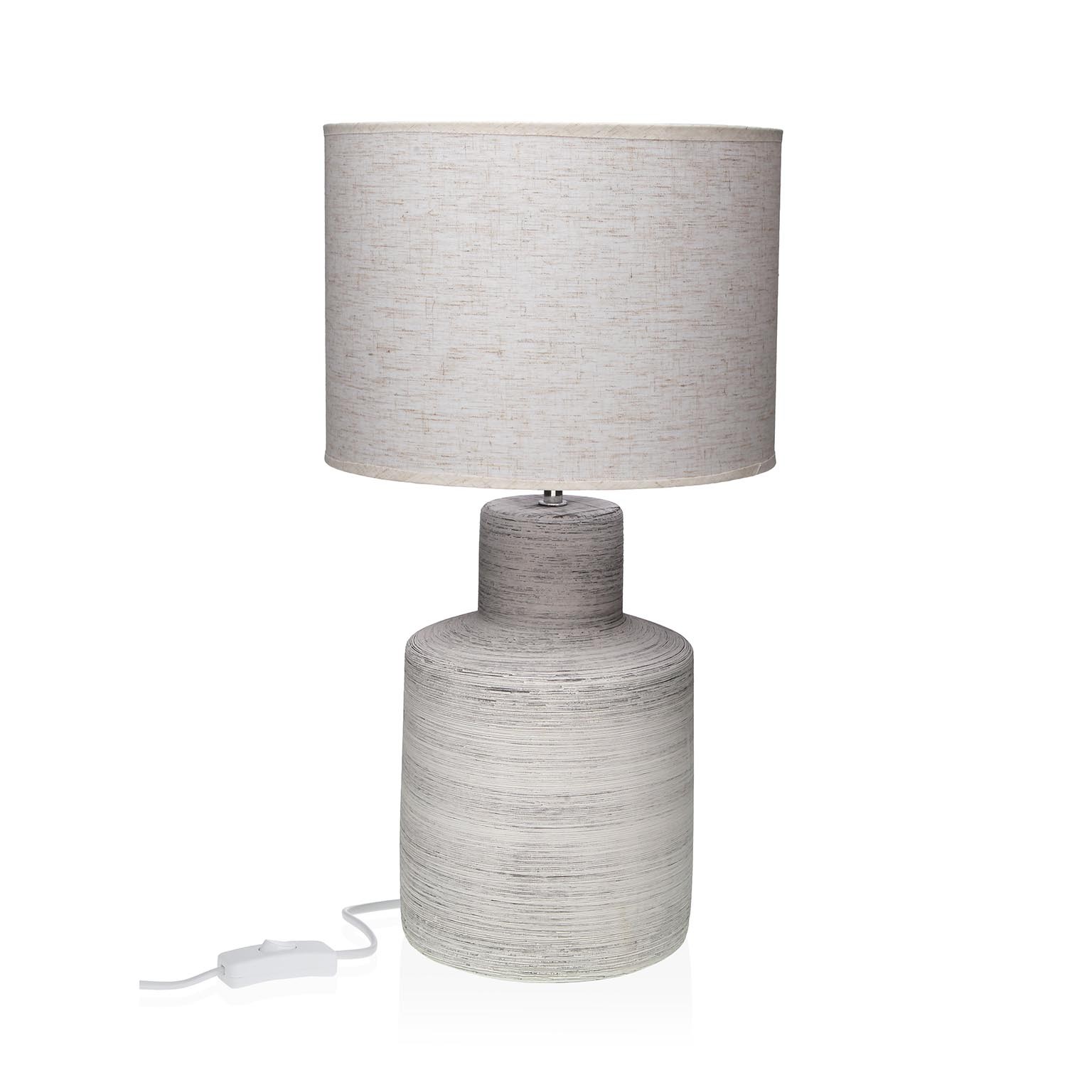 Realizzata in ceramica con una base solida e un elegante paralume in tessuto, presenta dimensioni di 55,5 cm di altezza, 20 cm di larghezza e 30 cm di lunghezza.