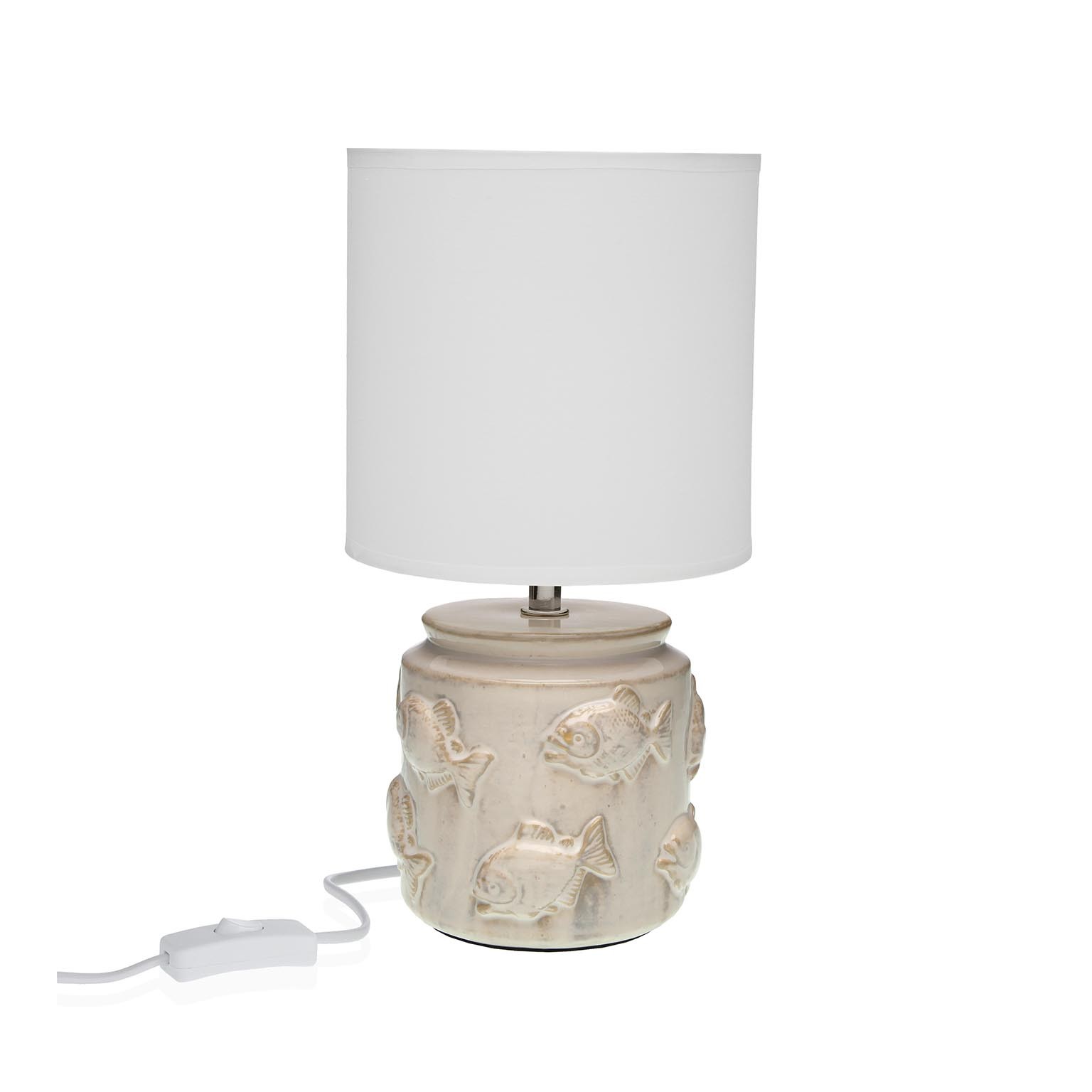 Realizzata in ceramica con una base decorata, presenta una tulipa in tessuto che diffonde una luce calda e accogliente.