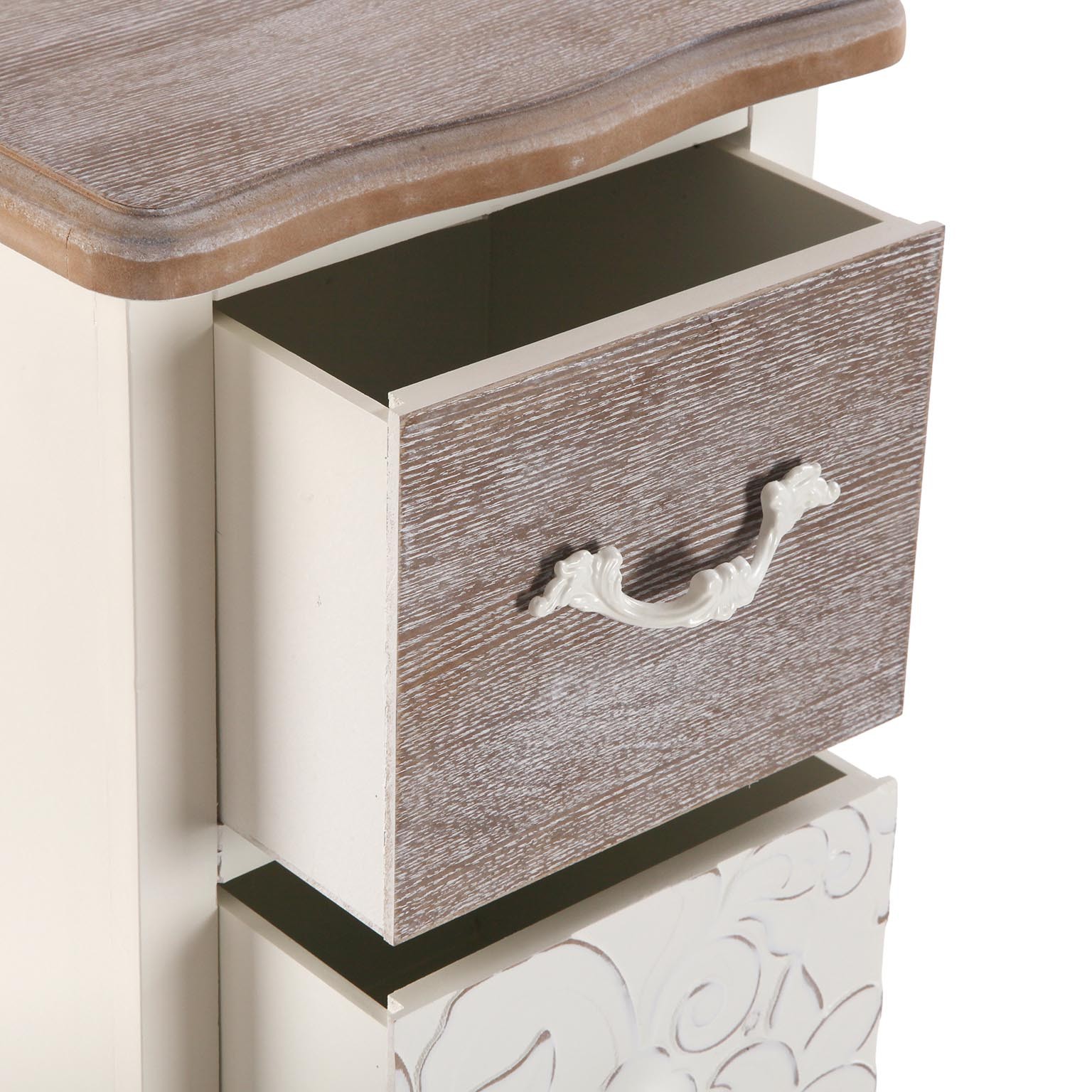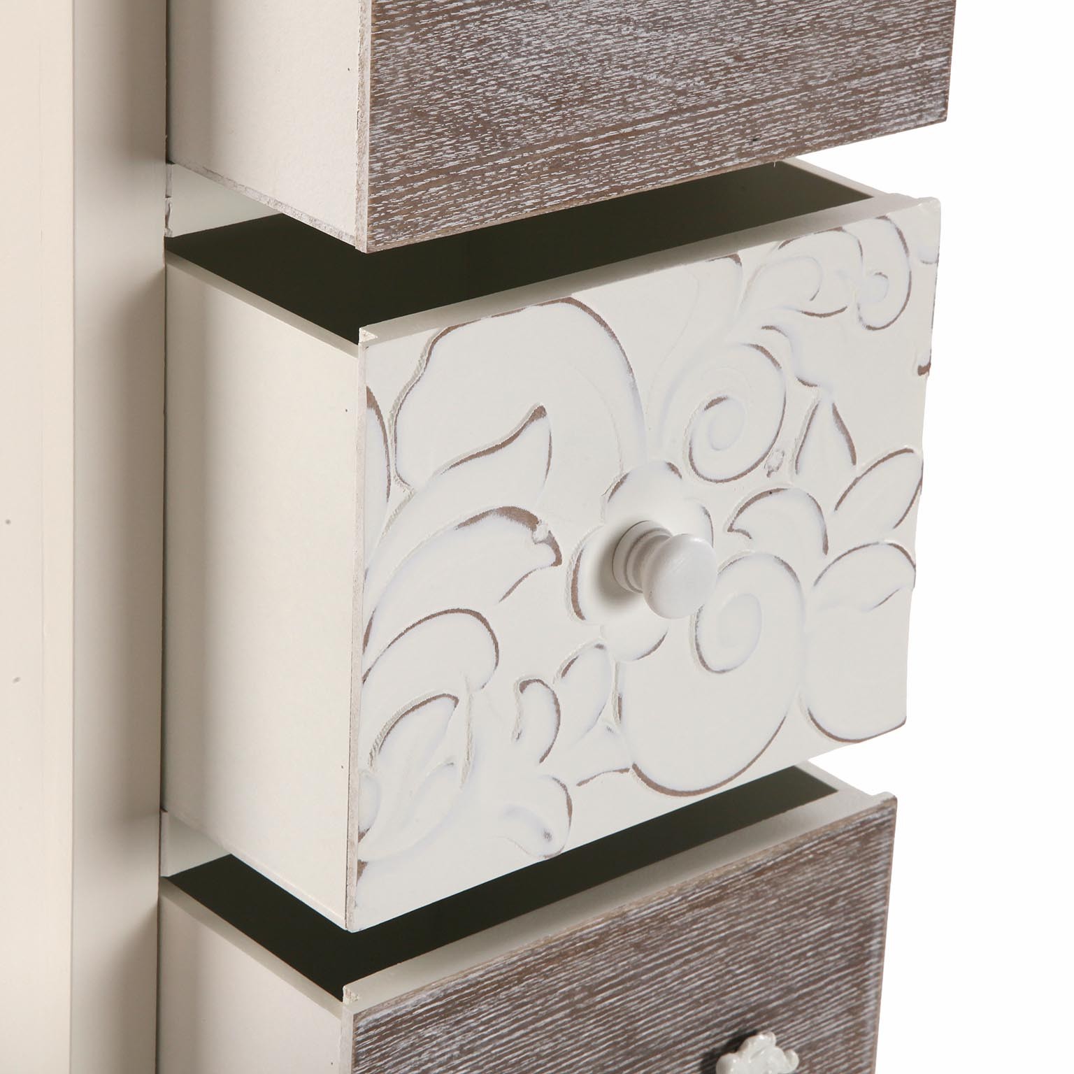 Le sue dimensioni compatte (115 cm di altezza, 24 cm di larghezza e 30 cm di lunghezza) lo rendono perfetto per spazi ristretti, mentre i cassetti offrono ampio spazio per riporre oggetti.