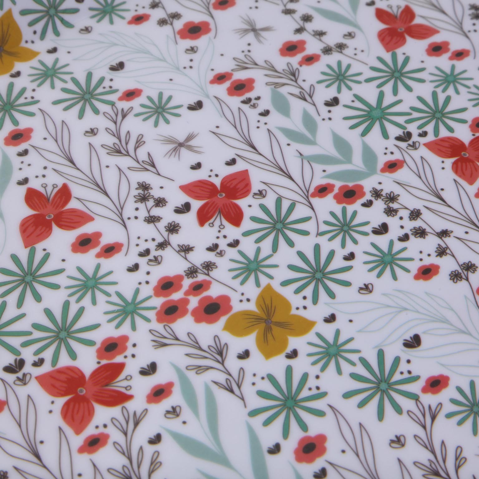 Con dimensioni di 46,2 cm di lunghezza, 31 cm di larghezza e 3 cm di altezza, presenta un design moderno caratterizzato da un elegante motivo floreale nei toni del bianco, rosso, verde, giallo e nero.