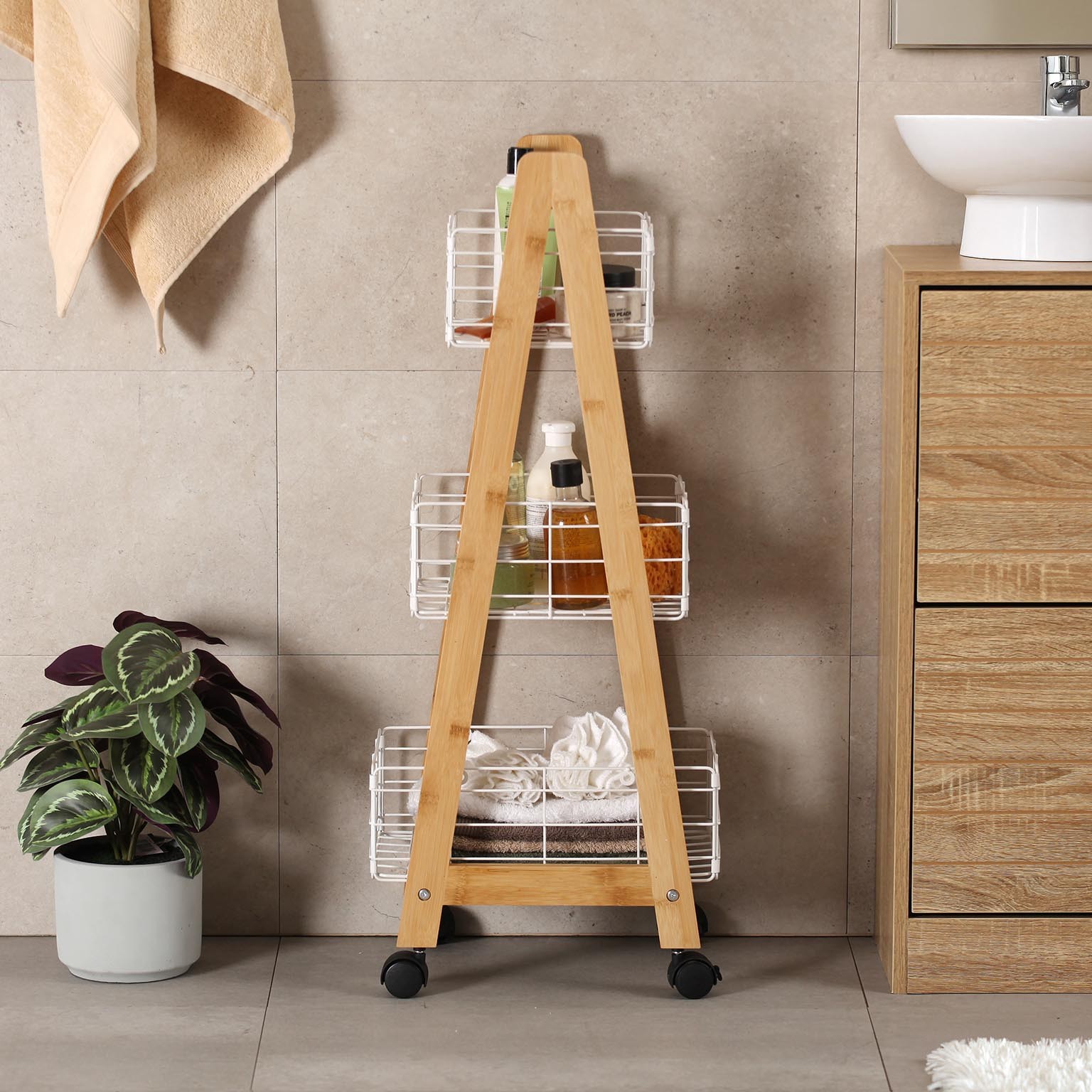 La struttura in bambù, materiale sostenibile e resistente, si combina con ceste in metallo bianco, pratiche e facili da pulire.