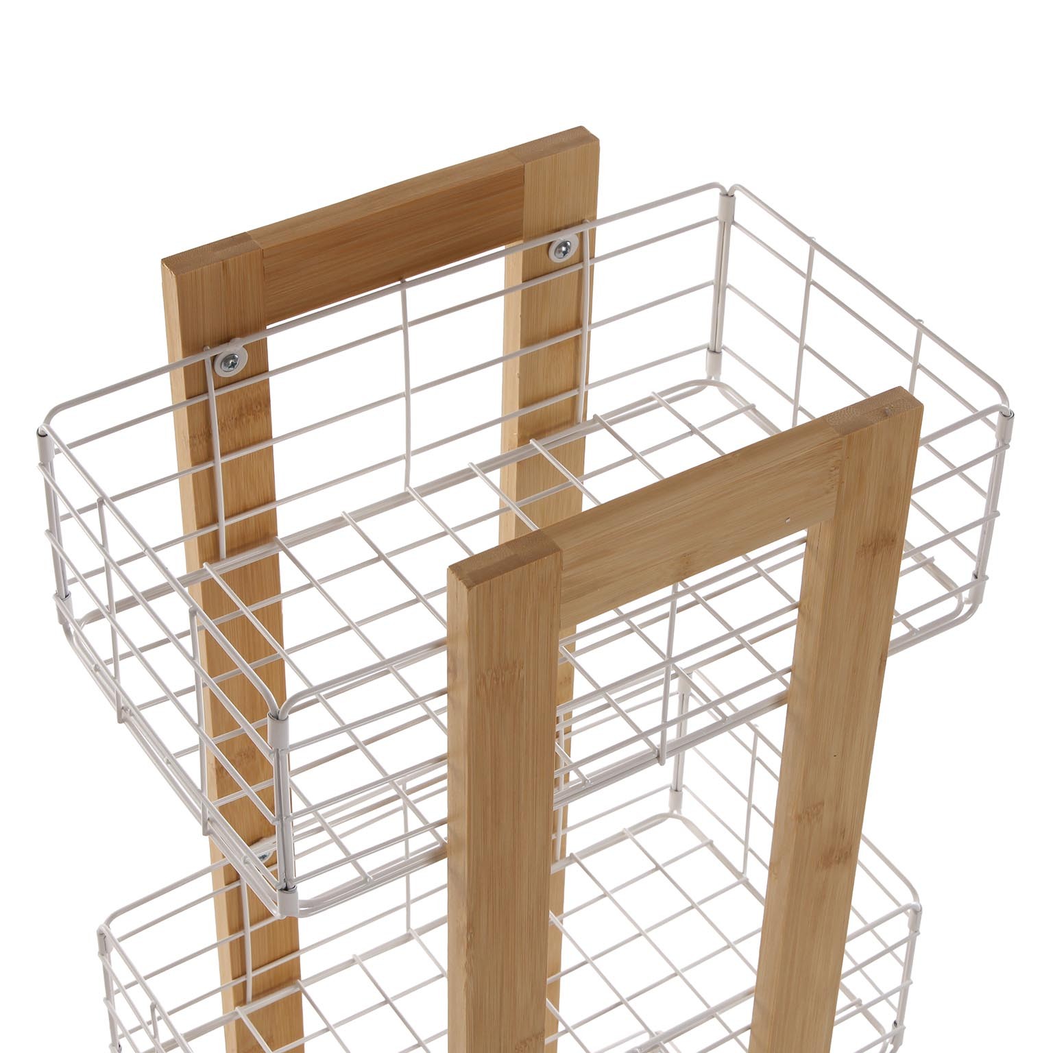 La struttura in bambù, resistente e sostenibile, si combina con ceste in metallo verniciato bianco, pratiche e facili da pulire.