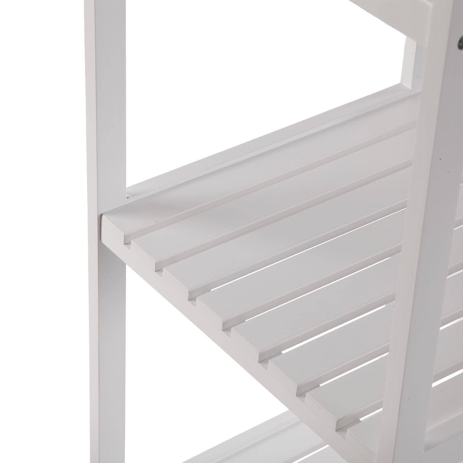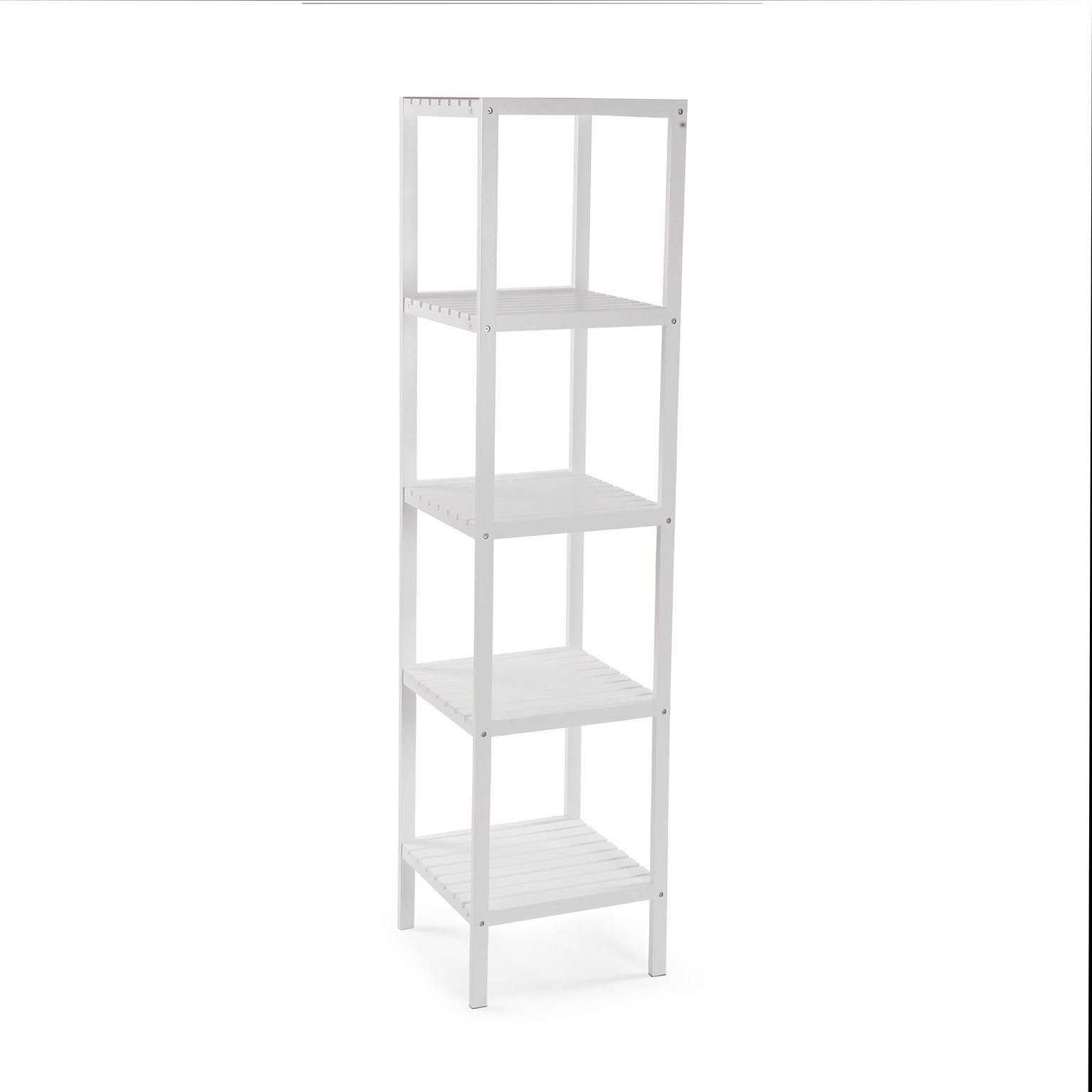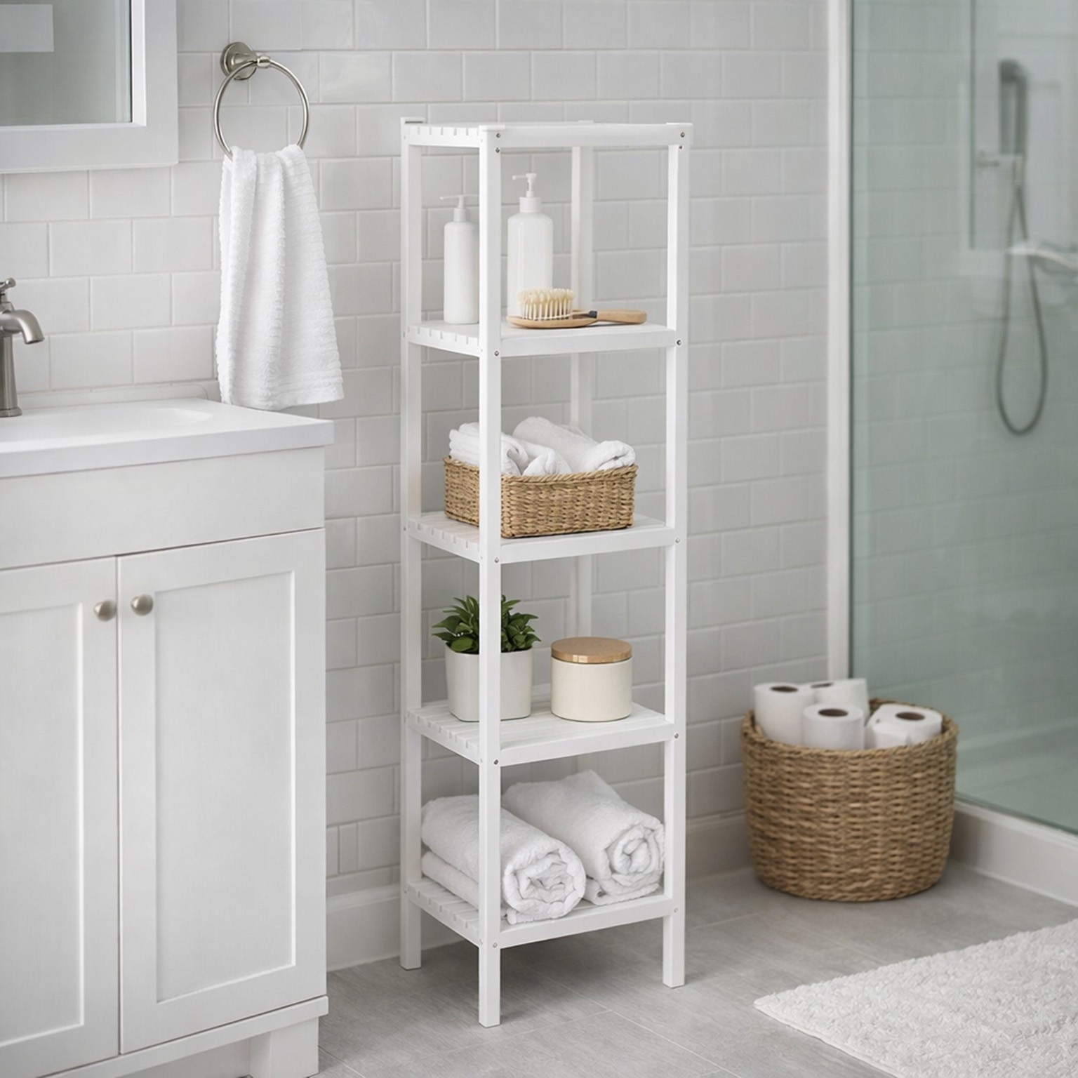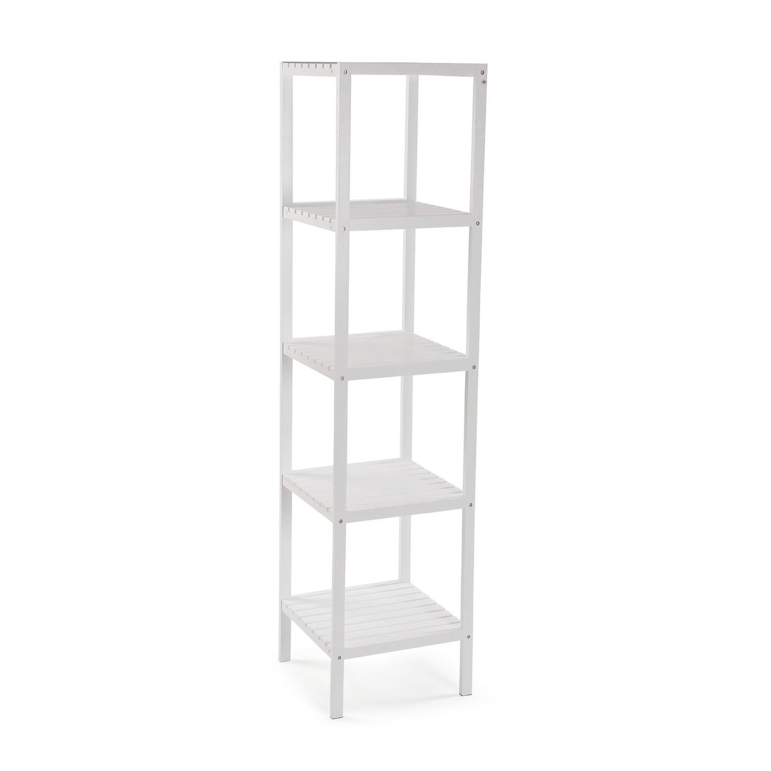 Scaffale bianco a 5 ripiani, progettato per ottimizzare l'organizzazione degli spazi interni, in particolare nel bagno.