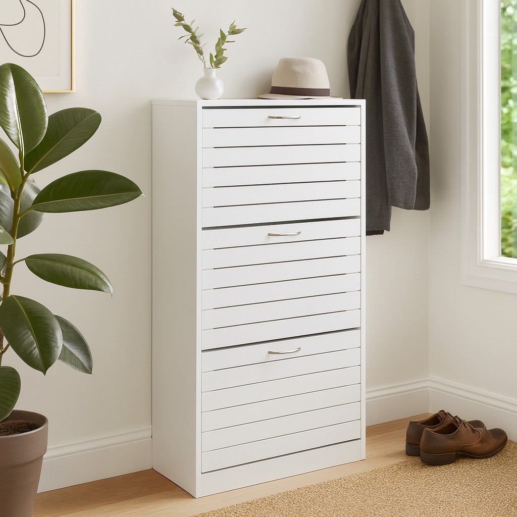 Scarpiera a 3 cassetti bianca, realizzata in legno MDF con finitura in melanina, è la soluzione ideale per l'organizzazione delle calzature negli spazi della casa.