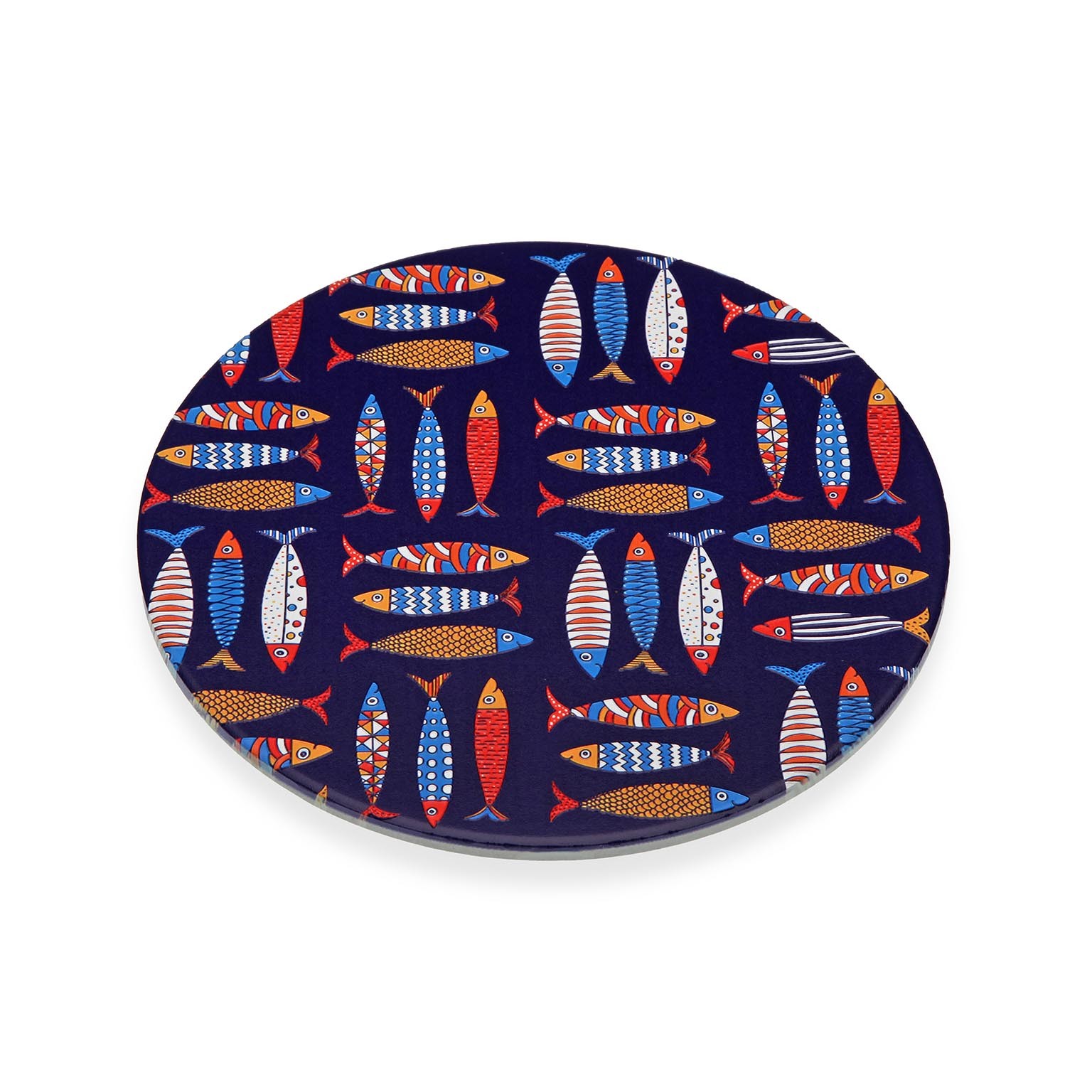 Con dimensioni di 20x20 cm, presenta un design etnico caratterizzato da motivi di pesci stilizzati in blu navy, arricchiti da dettagli in rosso, bianco e giallo.