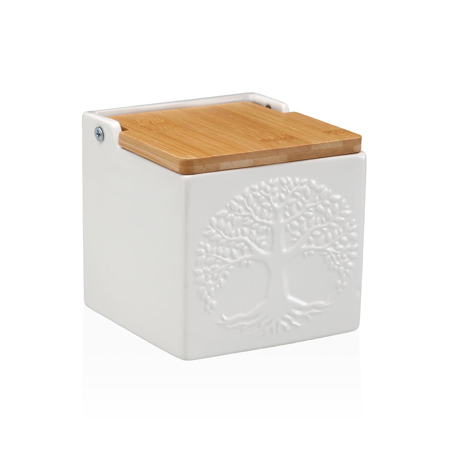 La saliera quadrata bianca albero è un accessorio da cucina elegante e funzionale, realizzata in dolomite con un coperchio in bambù.
