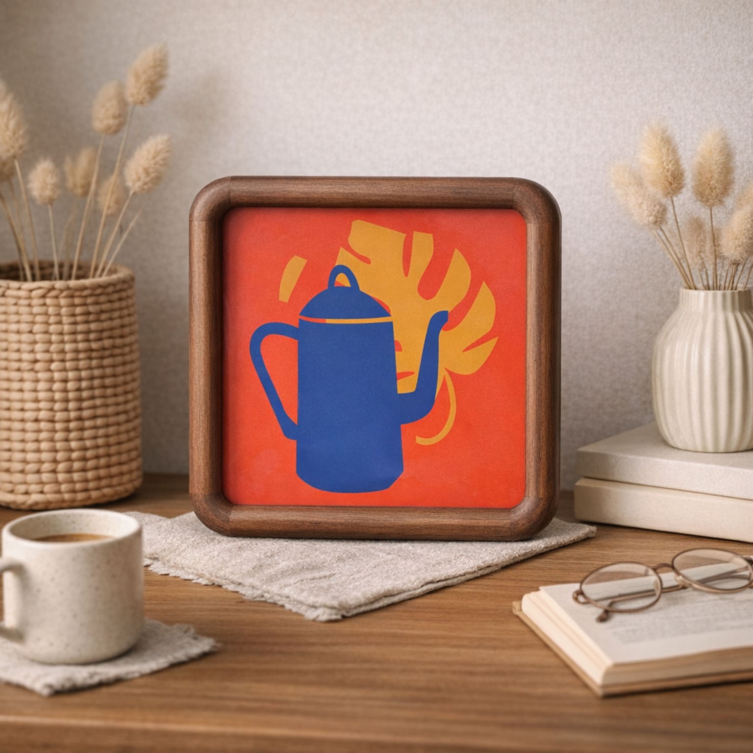 Perfetta per essere posizionata su mensole o appesa, si integra facilmente con altri elementi decorativi in legno o colori vivaci.