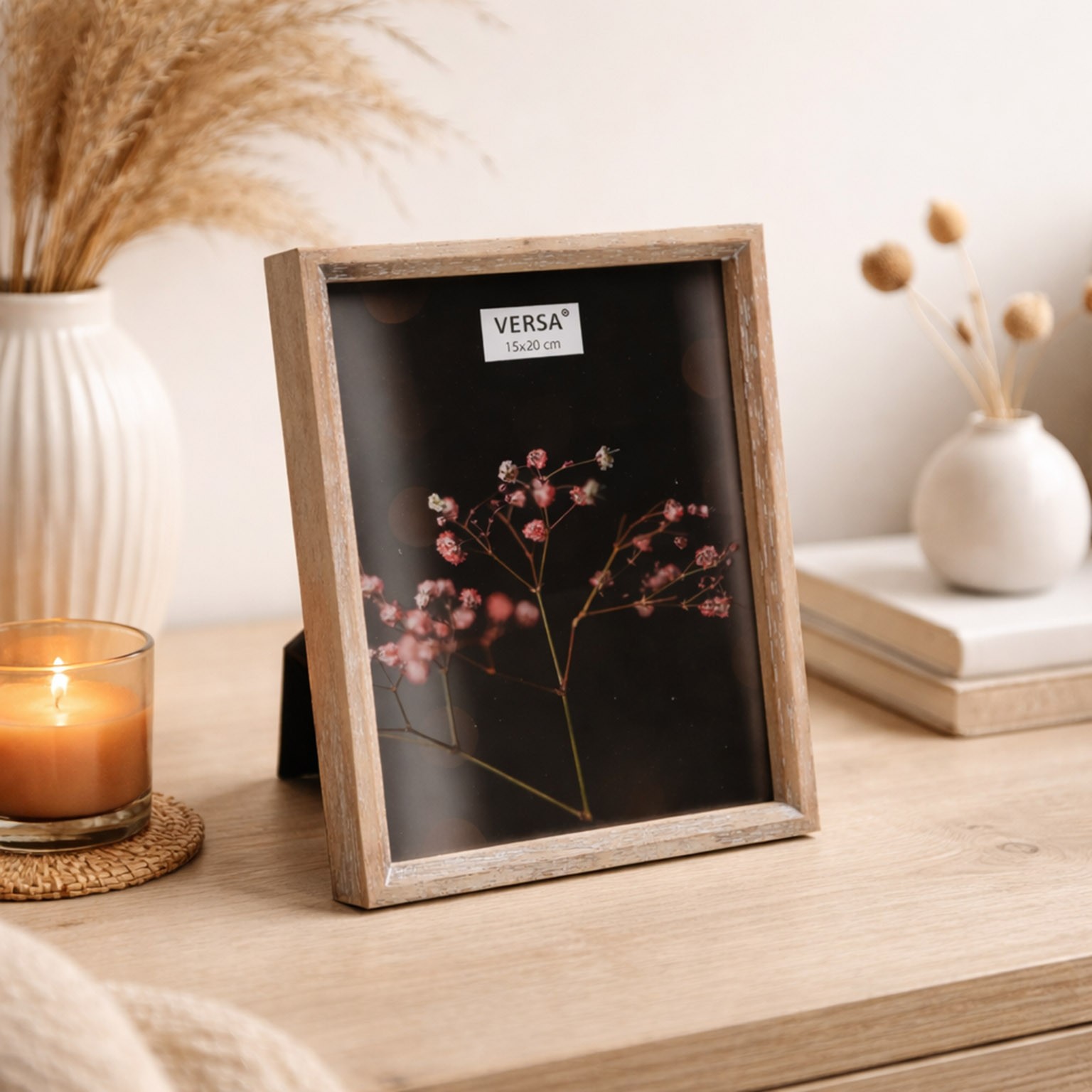 I toni neutri e caldi del legno la rendono versatile, ideale per esporre fotografie o opere d'arte, integrandosi armoniosamente con altri elementi decorativi in legno o materiali naturali.