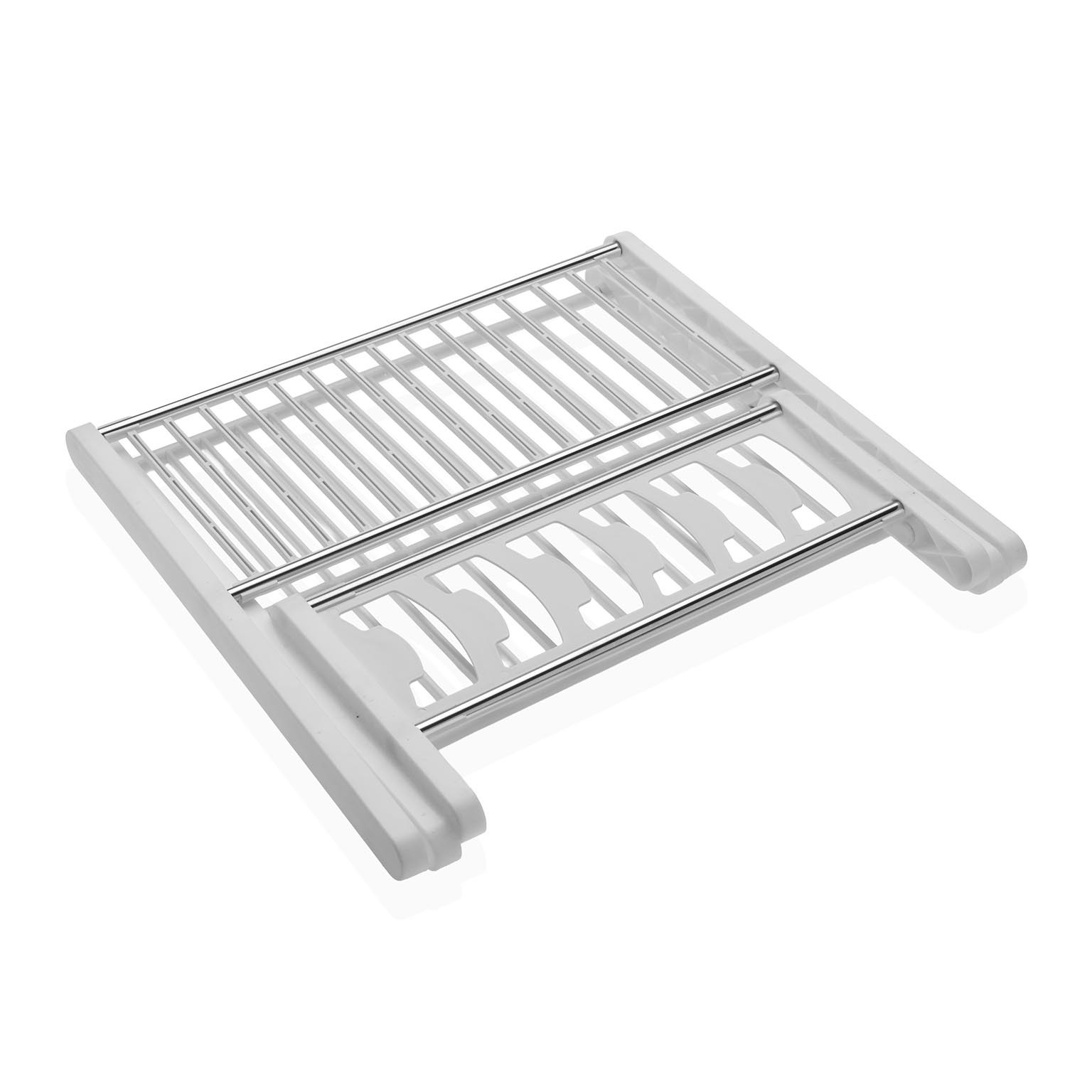 Scolapiatti pieghevole bianco in acciaio e polipropilene, progettato per un'asciugatura efficiente di piatti e utensili da cucina.