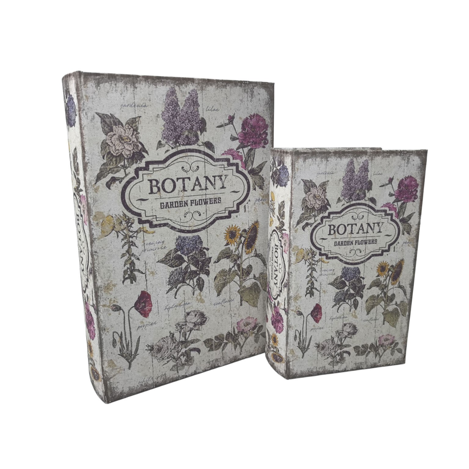 Con dimensioni di 7 cm in altezza, 18 cm in larghezza e 27 cm in lunghezza, questi libri presentano un design vintage caratterizzato da toni neutri e dettagli floreali in colori pastello.