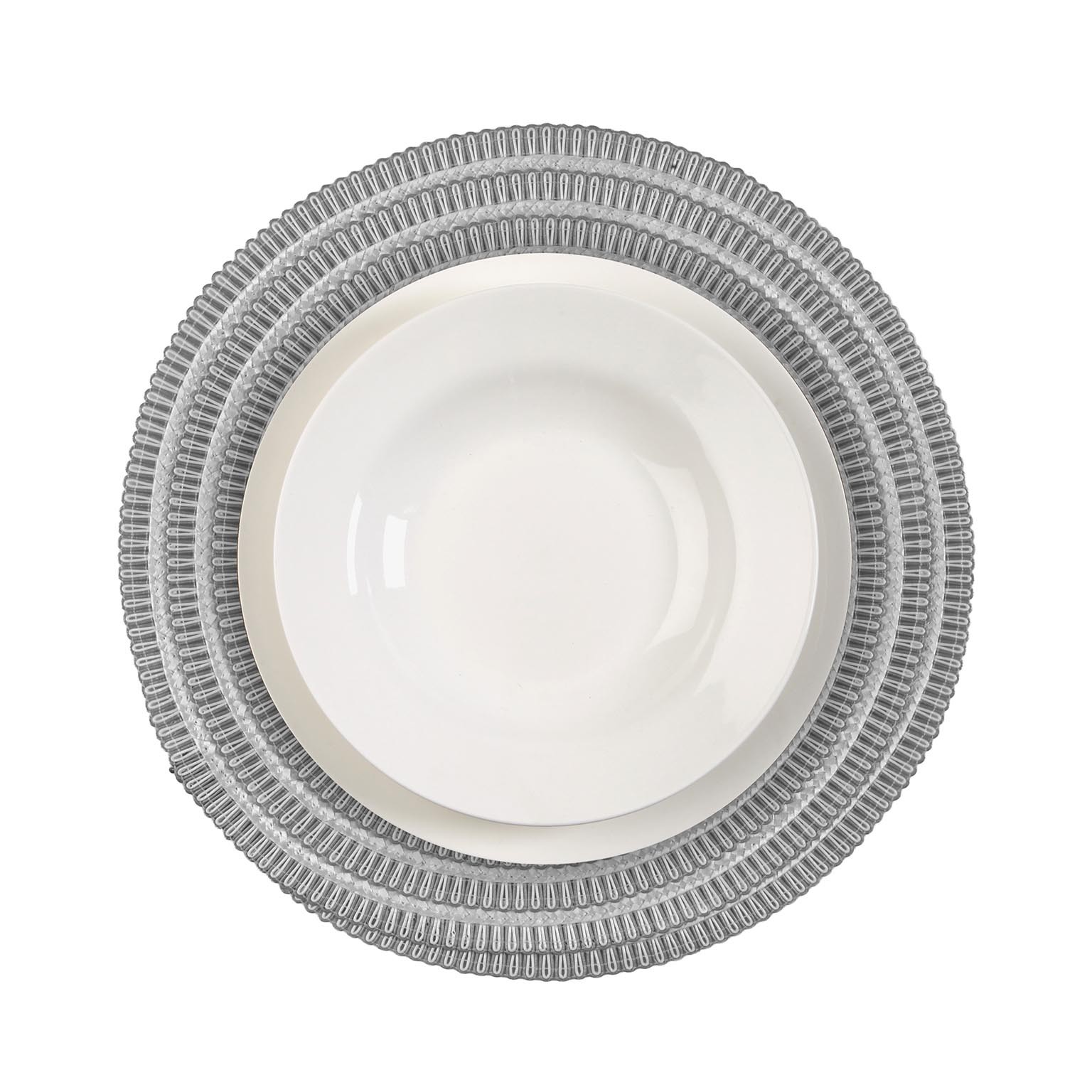 La tovaglietta rotonda grigia e bianca rappresenta un elemento essenziale per il servizio da tavola, unendo funzionalità e stile.