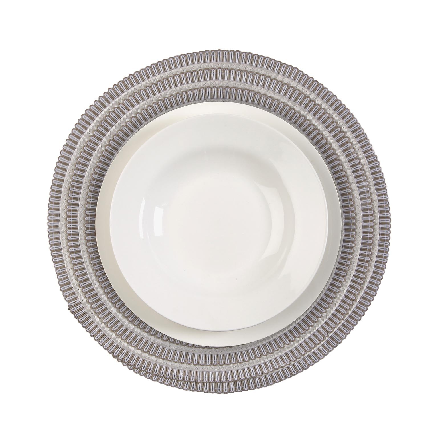 Scopri la tovaglietta rotonda beige e bianca, un elemento essenziale per il servizio da tavola.