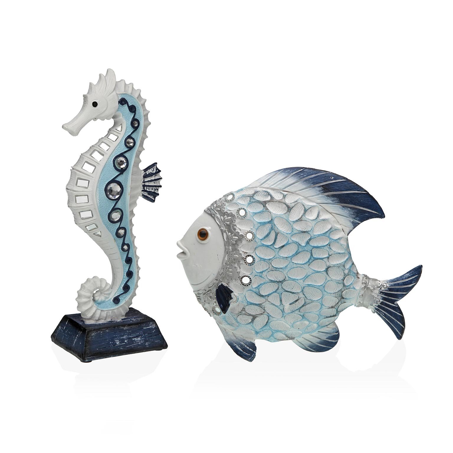 Statuetta decorativa a forma di cavalluccio marino, realizzata in ceramica e metallo, con un'altezza di 25,7 cm, larghezza di 6,6 cm e lunghezza di 9,7 cm.