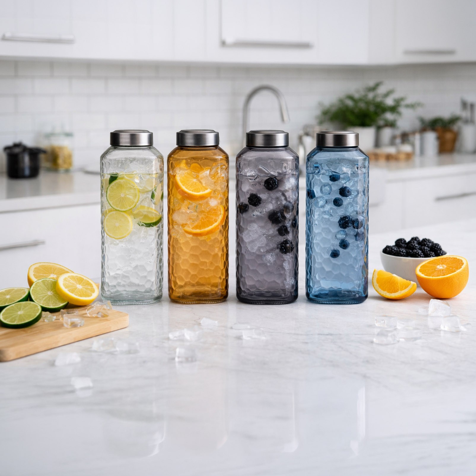 La bottiglia in vetro trasparente da 1,3 litri è un accessorio versatile per la cucina, progettata per la conservazione di liquidi come acqua, succhi e tè freddo.