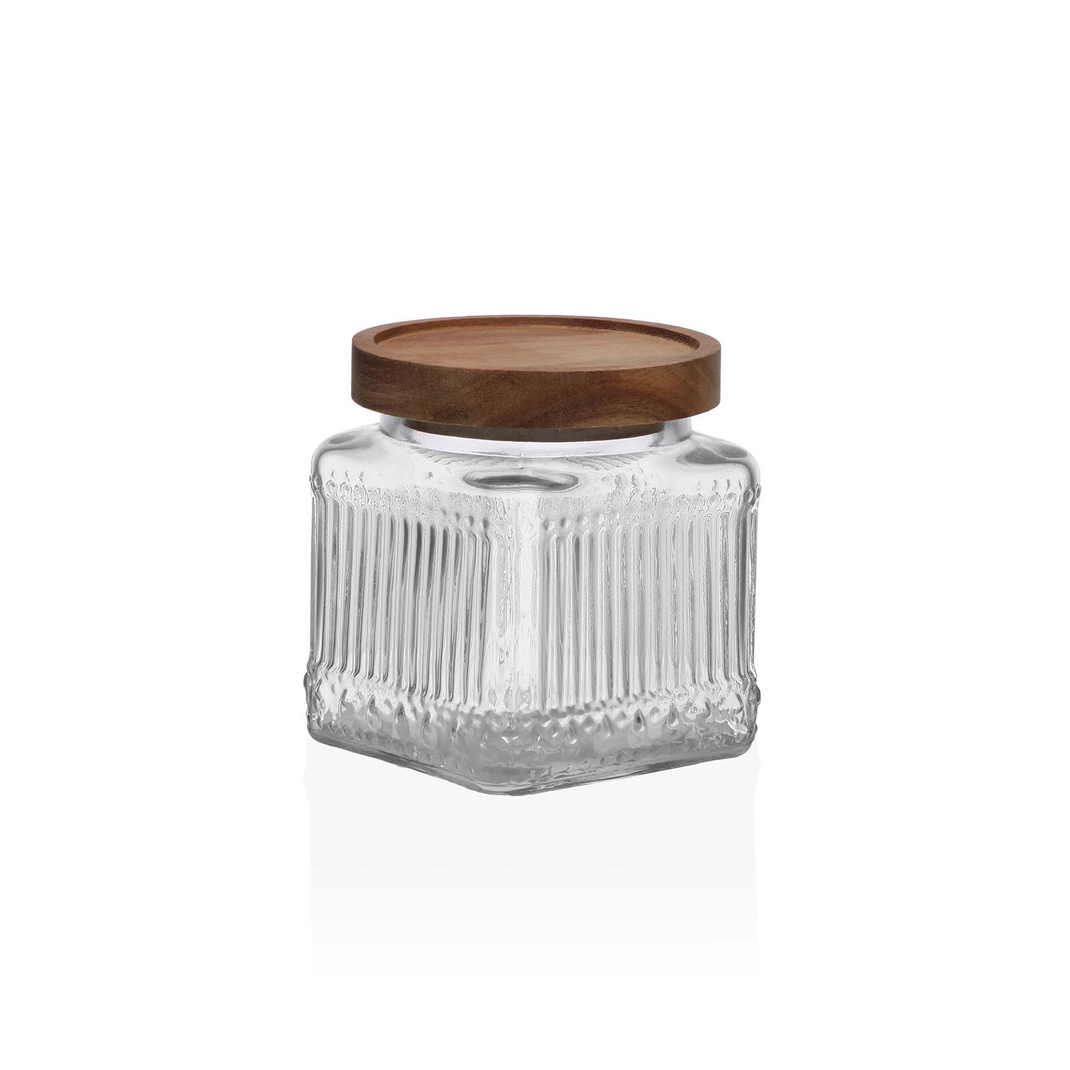 Realizzato in cristallo trasparente, offre una visibilità immediata del contenuto, mentre il tappo in legno di acacia aggiunge un tocco naturale e rustico.