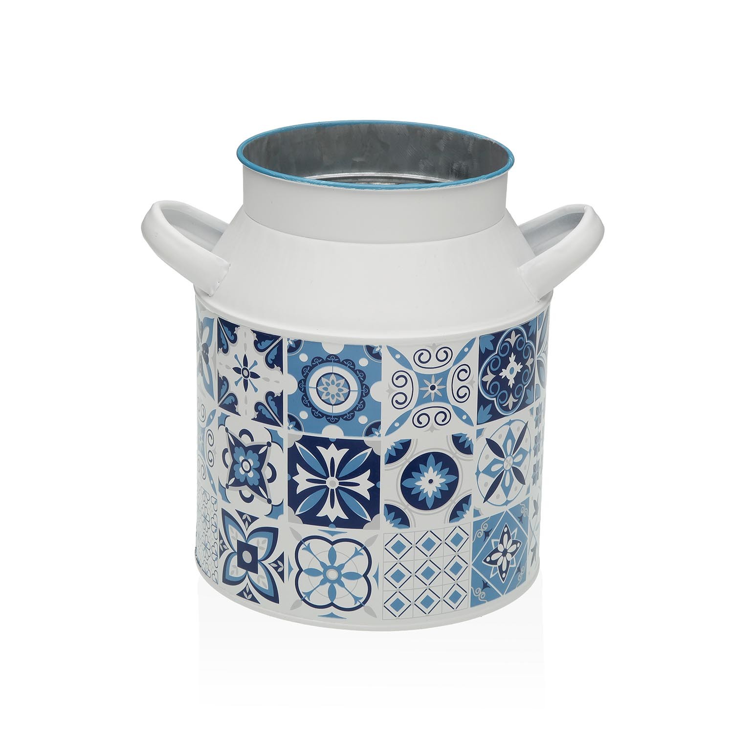 Realizzato in metallo con una raffinata finitura verniciata, presenta una combinazione di blu e bianco, arricchita da motivi decorativi che richiamano tradizioni artigianali.