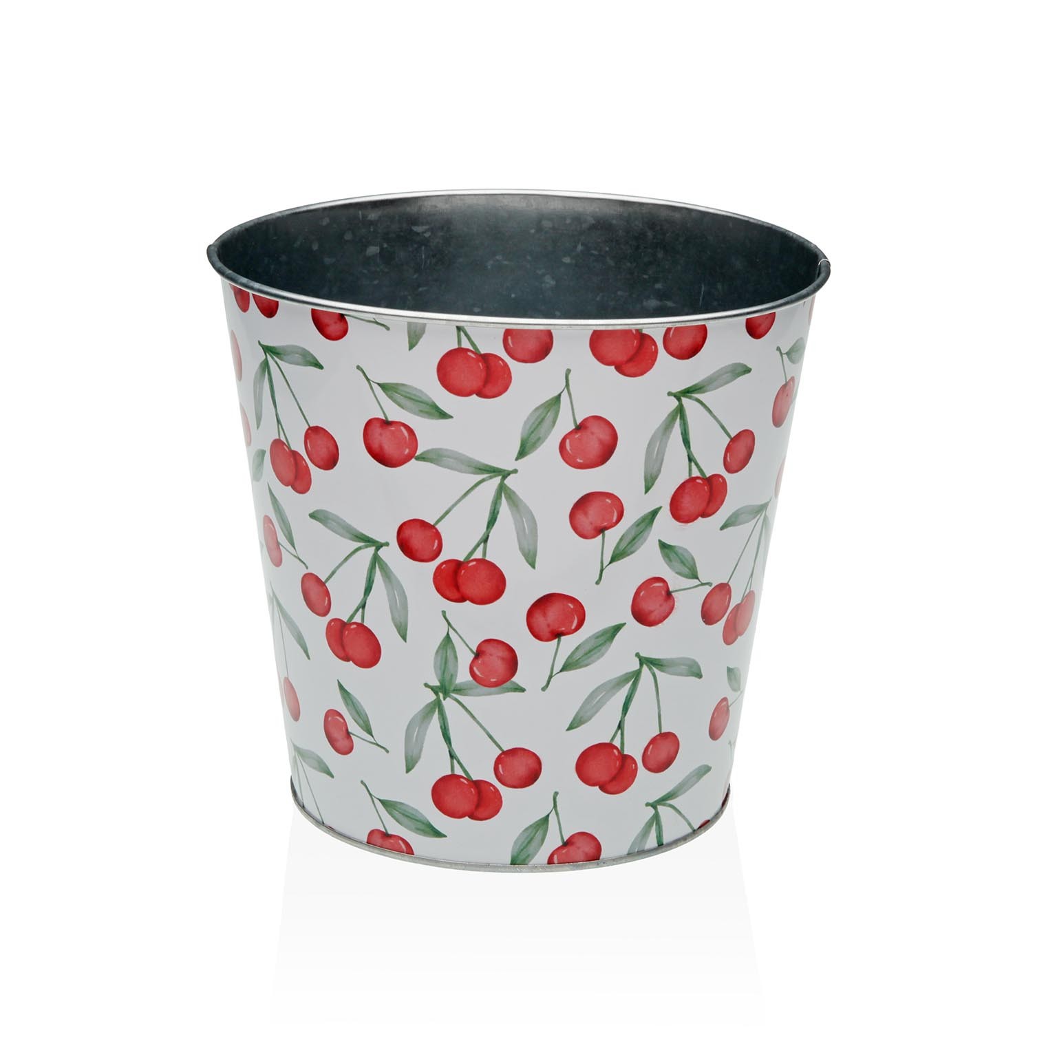 Il vaso cherries metallico XL è un elemento decorativo distintivo per piante, realizzato in metallo con una vivace finitura bianca e motivi di ciliegie rosse e foglie verdi.