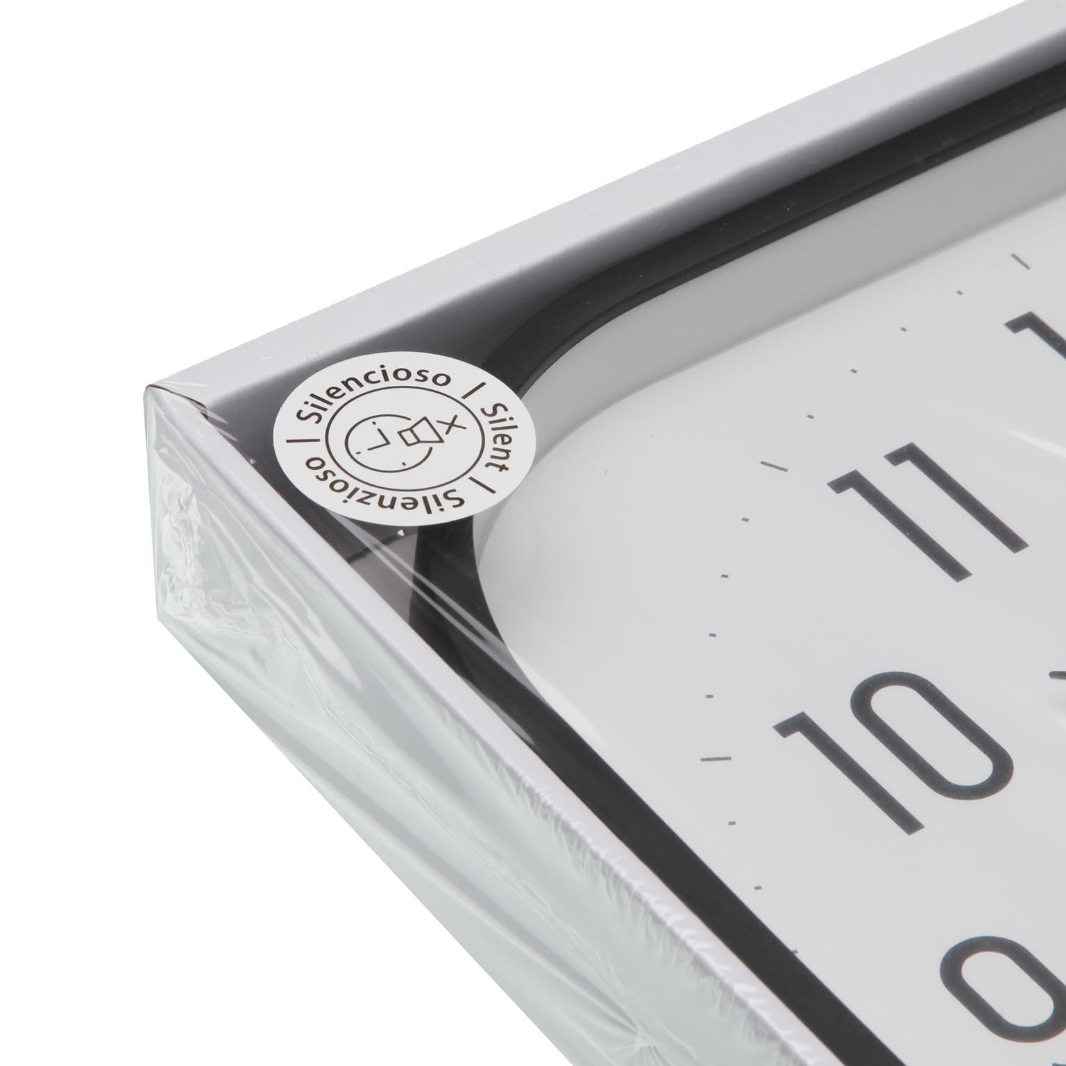 Realizzato in legno MDF e plastica, presenta un quadrante bianco che contrasta elegantemente con la cornice nera.