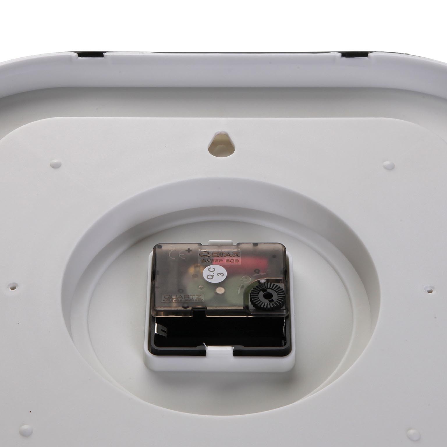 Realizzato in legno MDF e plastica, presenta un design moderno con cornice grigia e fondo bianco, numeri e lancette in nero.