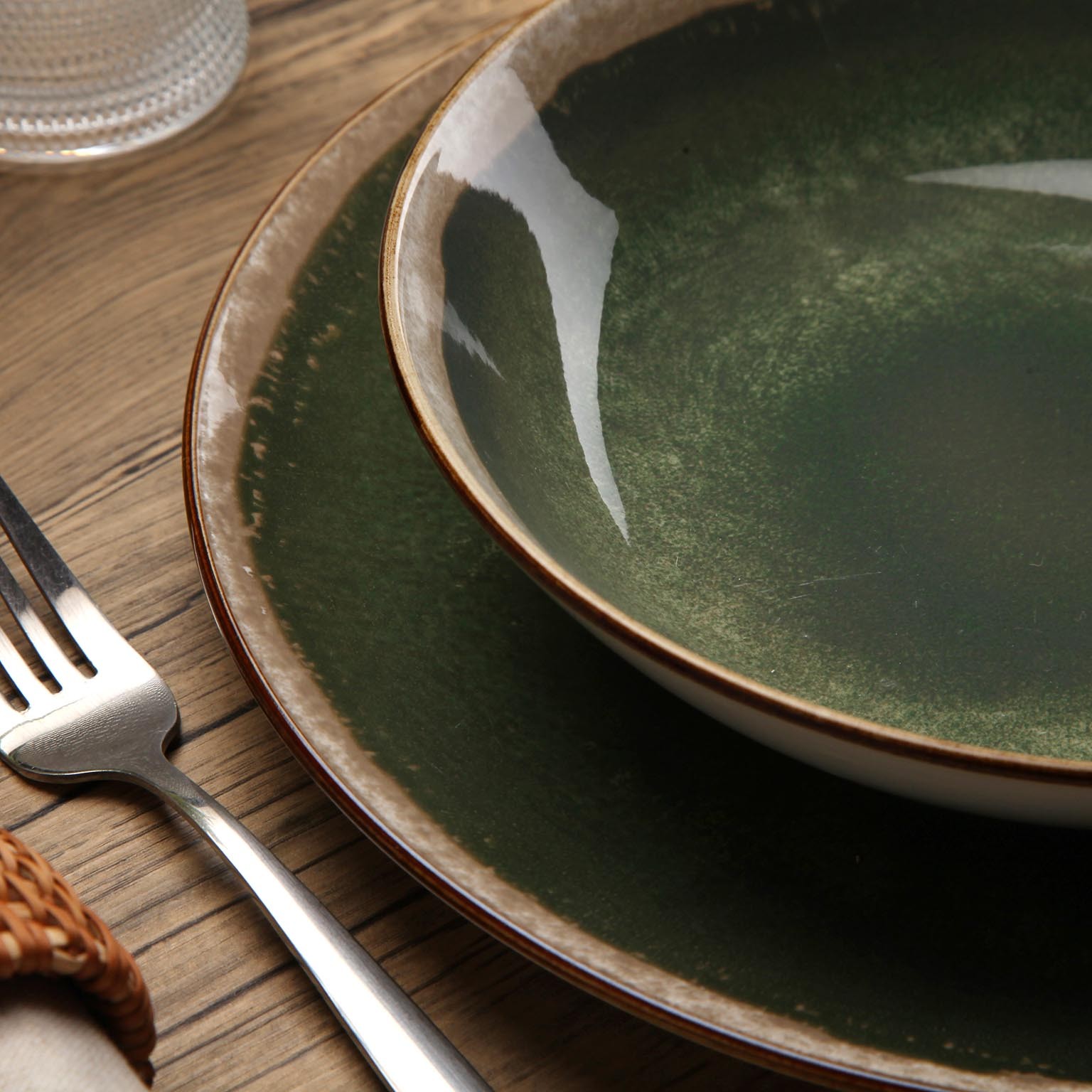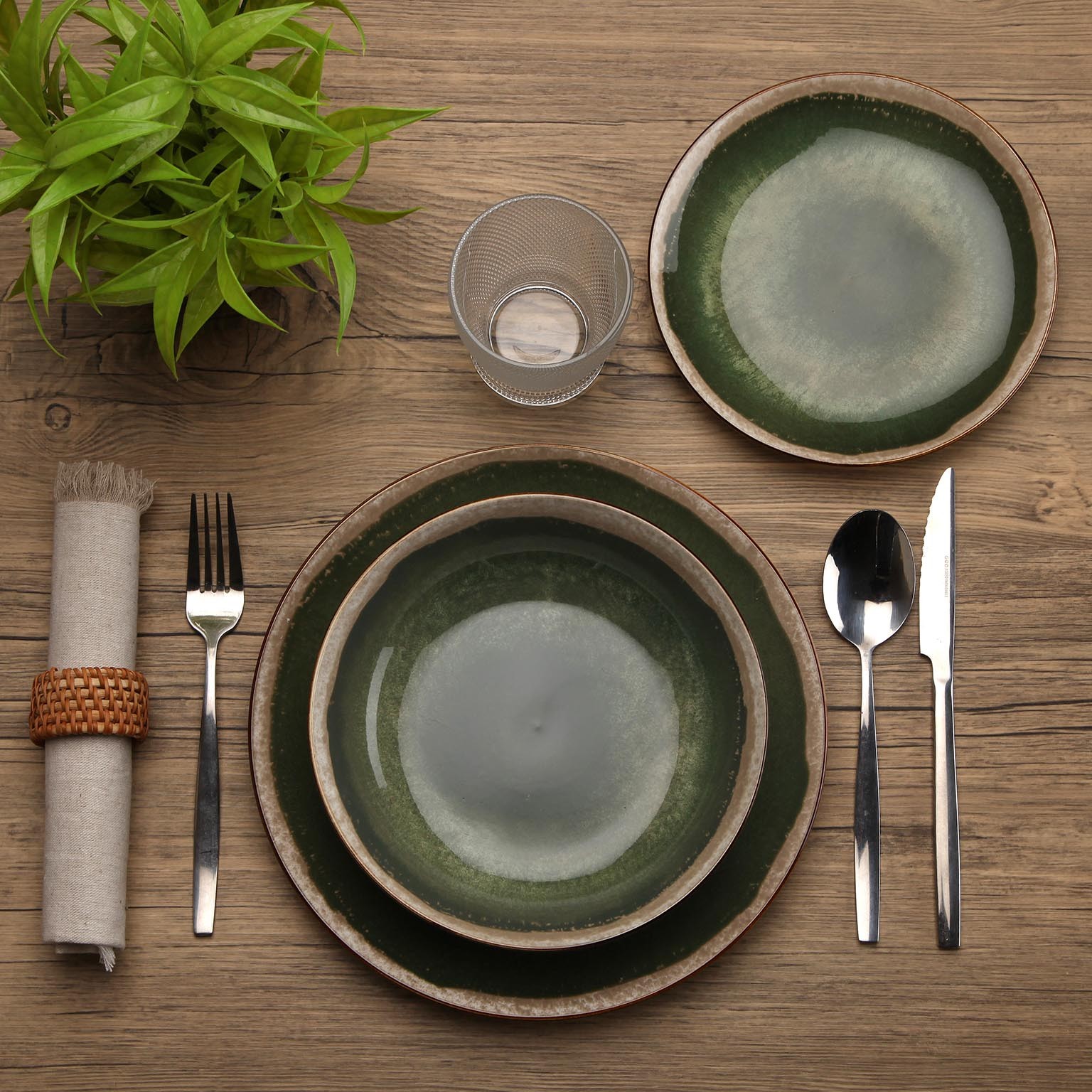 Le sfumature di verde scuro e i bordi neutri conferiscono un aspetto sofisticato, ideale per cene formali e pranzi quotidiani.