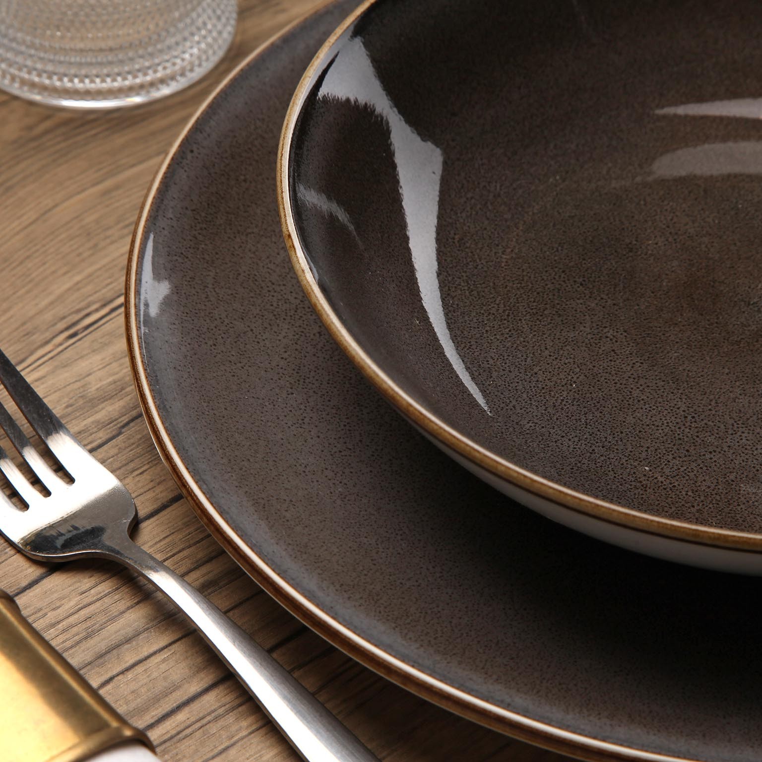 Questo set include 6 piatti piani da 26,5 cm, 6 piatti fondi da 20 cm e 6 piatti dessert da 19 cm, tutti caratterizzati da un design moderno e linee pulite.