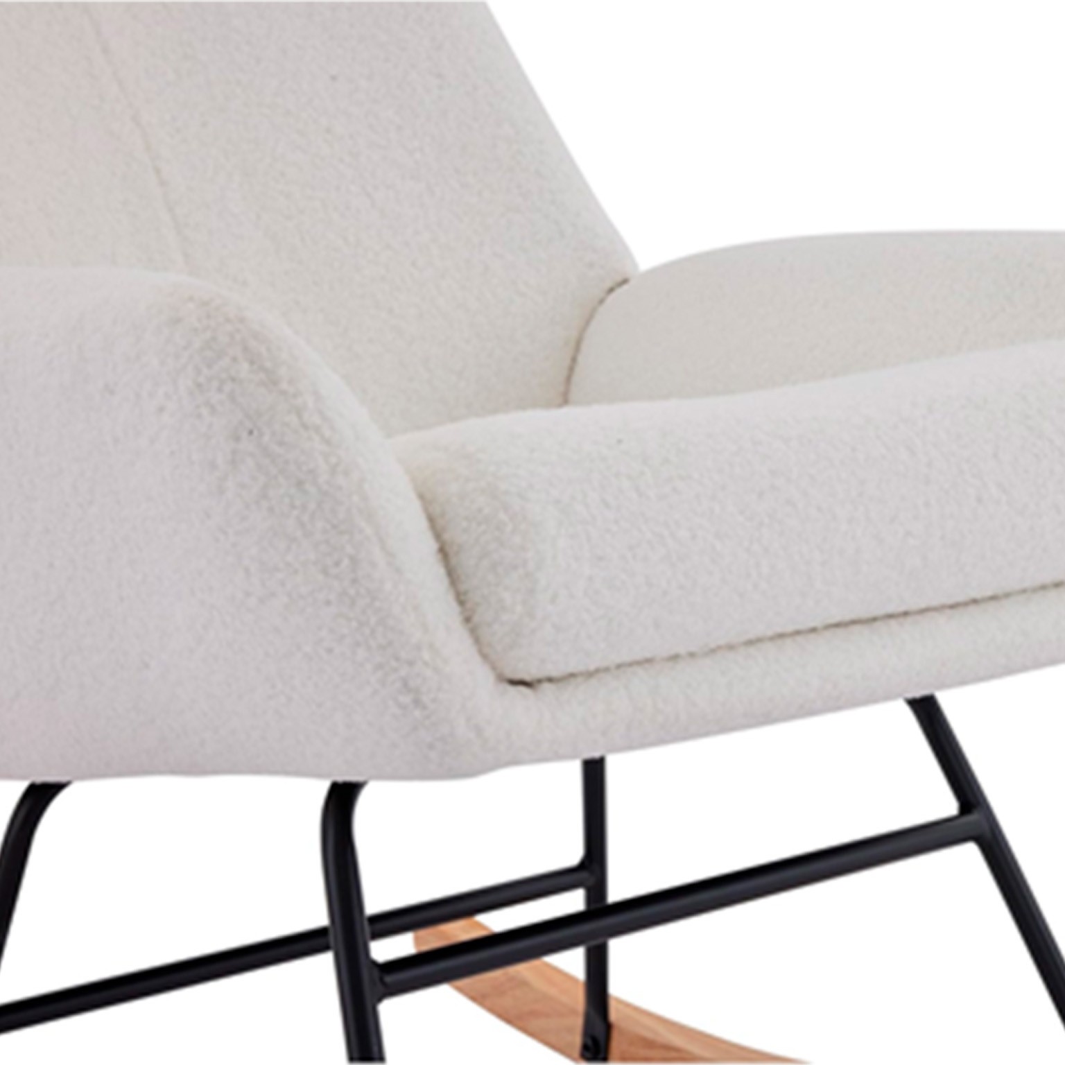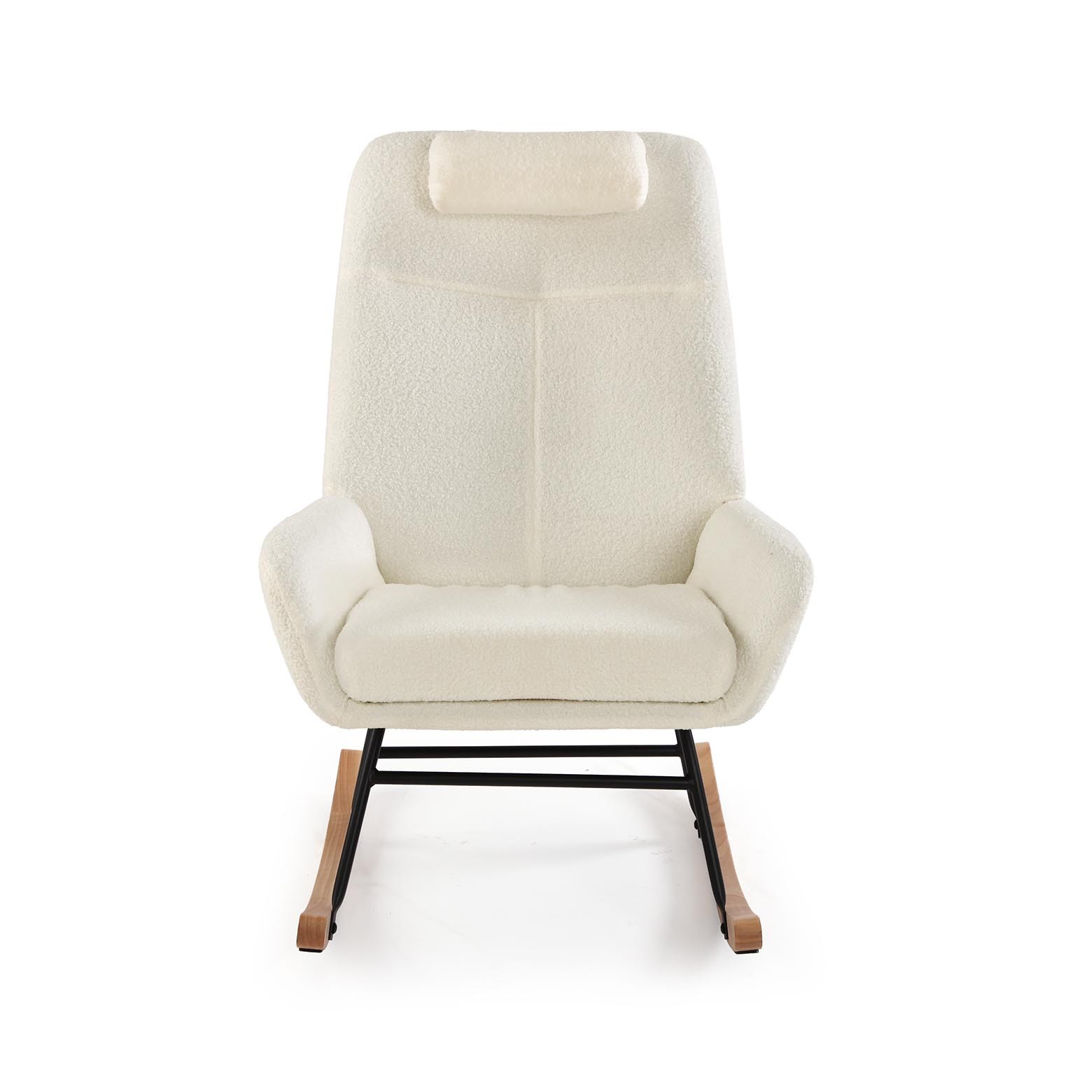 Scopri la sedia a dondolo con cuscino beige, un complemento d'arredo che unisce comfort e design moderno.