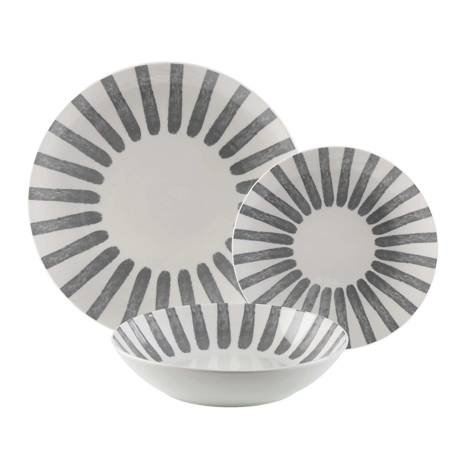 Include 6 piatti piani da 26,5 cm, 6 piatti fondi da 20 cm e 6 piatti dessert da 19 cm, tutti caratterizzati da un elegante design grigio e bianco.