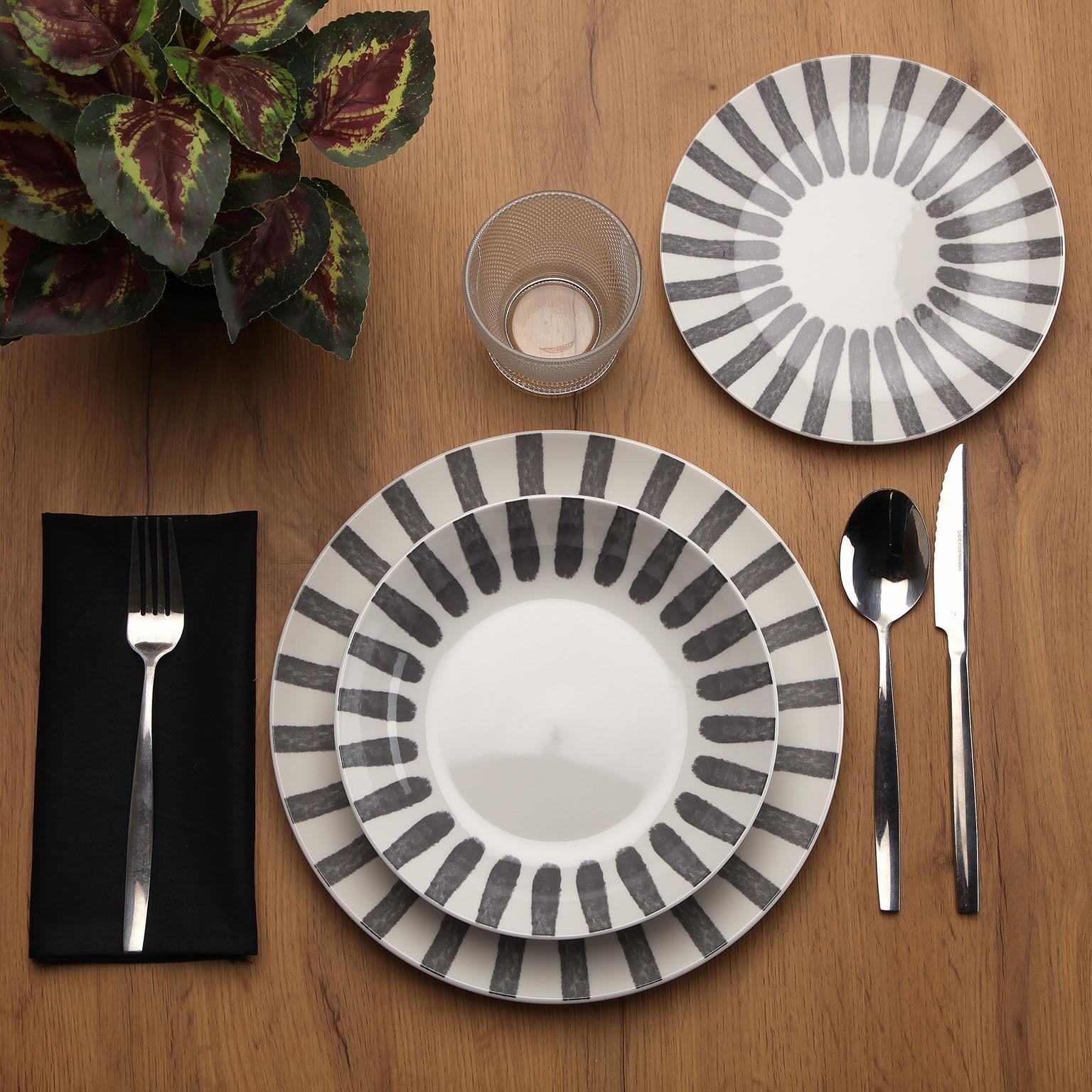 Il set di stoviglie Jungle Grigio è composto da 18 pezzi in porcellana, ideale per arricchire la tavola con un tocco moderno.
