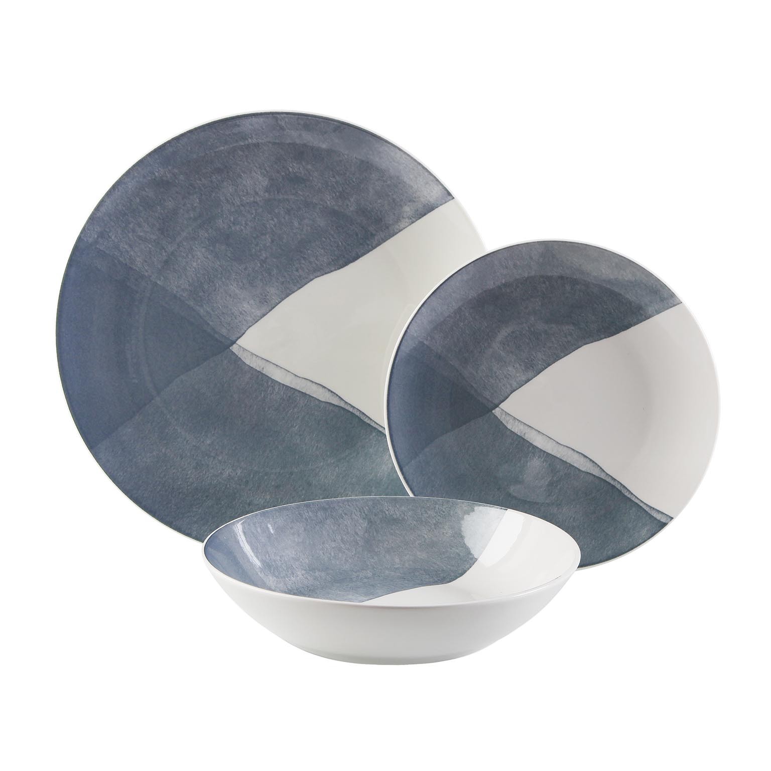 Composto da 6 piatti piani da 26,5 cm, 6 piatti fondi da 20 cm e 6 piatti da dessert da 19 cm, questo set in porcellana offre un design moderno con tonalità di blu che si integrano armoniosamente in qualsiasi contesto.