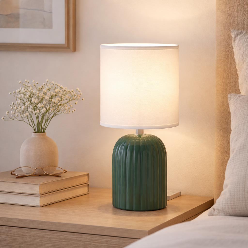 Realizzata con una base in ceramica verde e un paralume in tessuto bianco, si integra armoniosamente in diversi ambienti, dai soggiorni alle camere da letto.