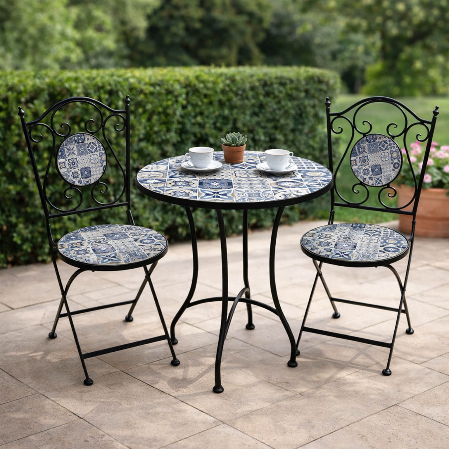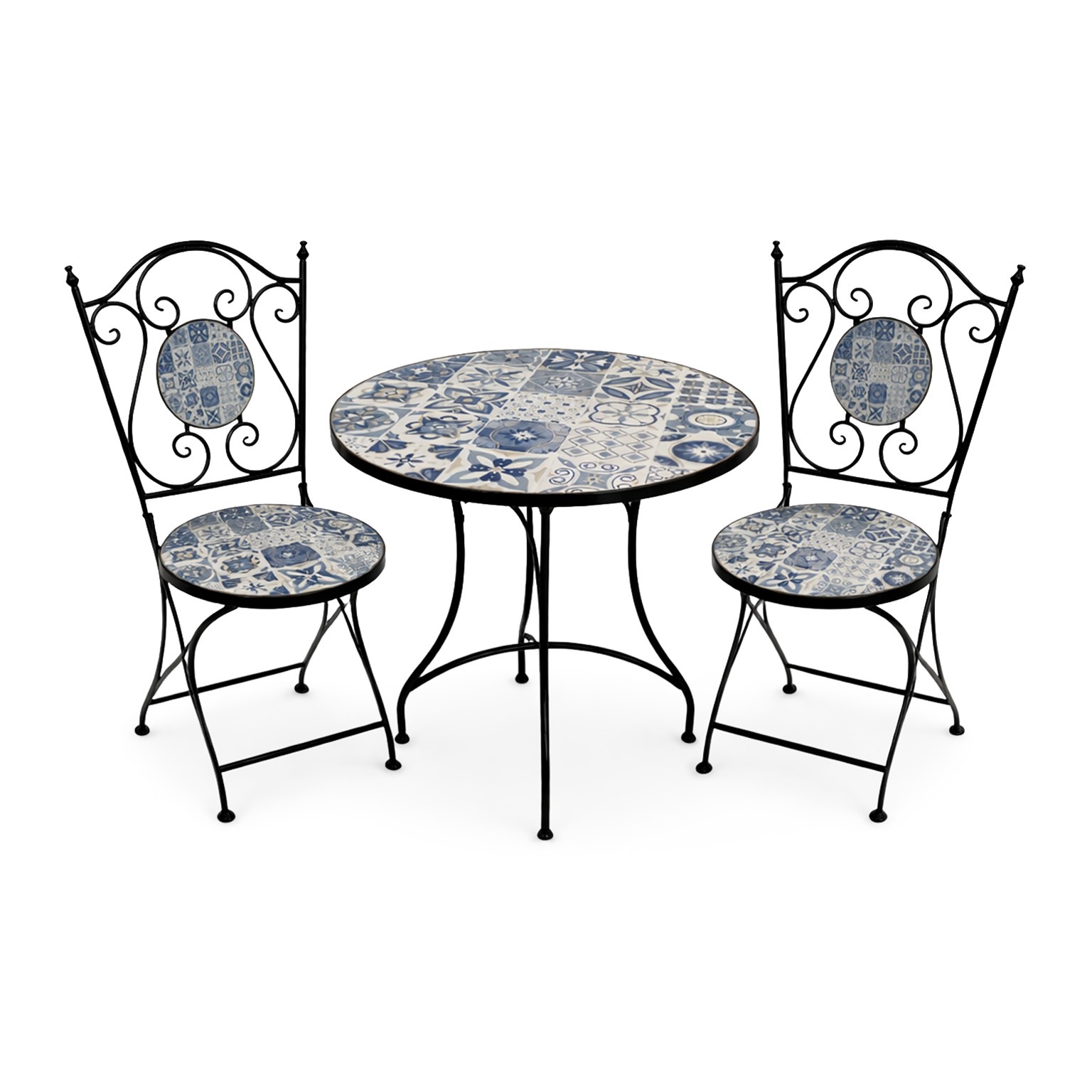 Realizzato in metallo, con un design che richiama lo stile etnico e mediterraneo, questo set è caratterizzato da un piano e sedute decorate in blu e bianco, arricchite da motivi geometrici o floreali.