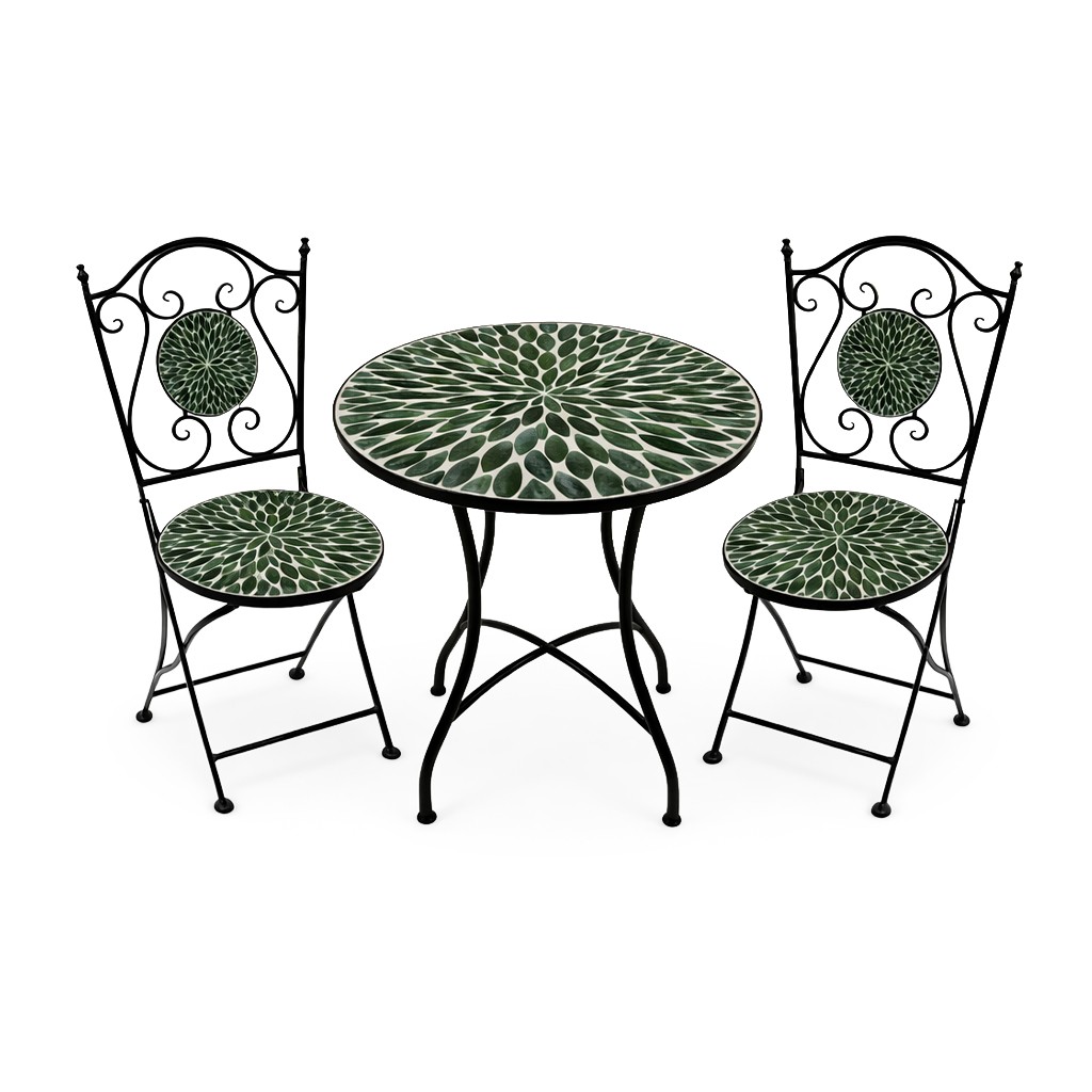 Il piano del tavolo e le sedute delle sedie sono decorati con un motivo floreale verde su fondo nero, evocando un'atmosfera etnica e mediterranea.