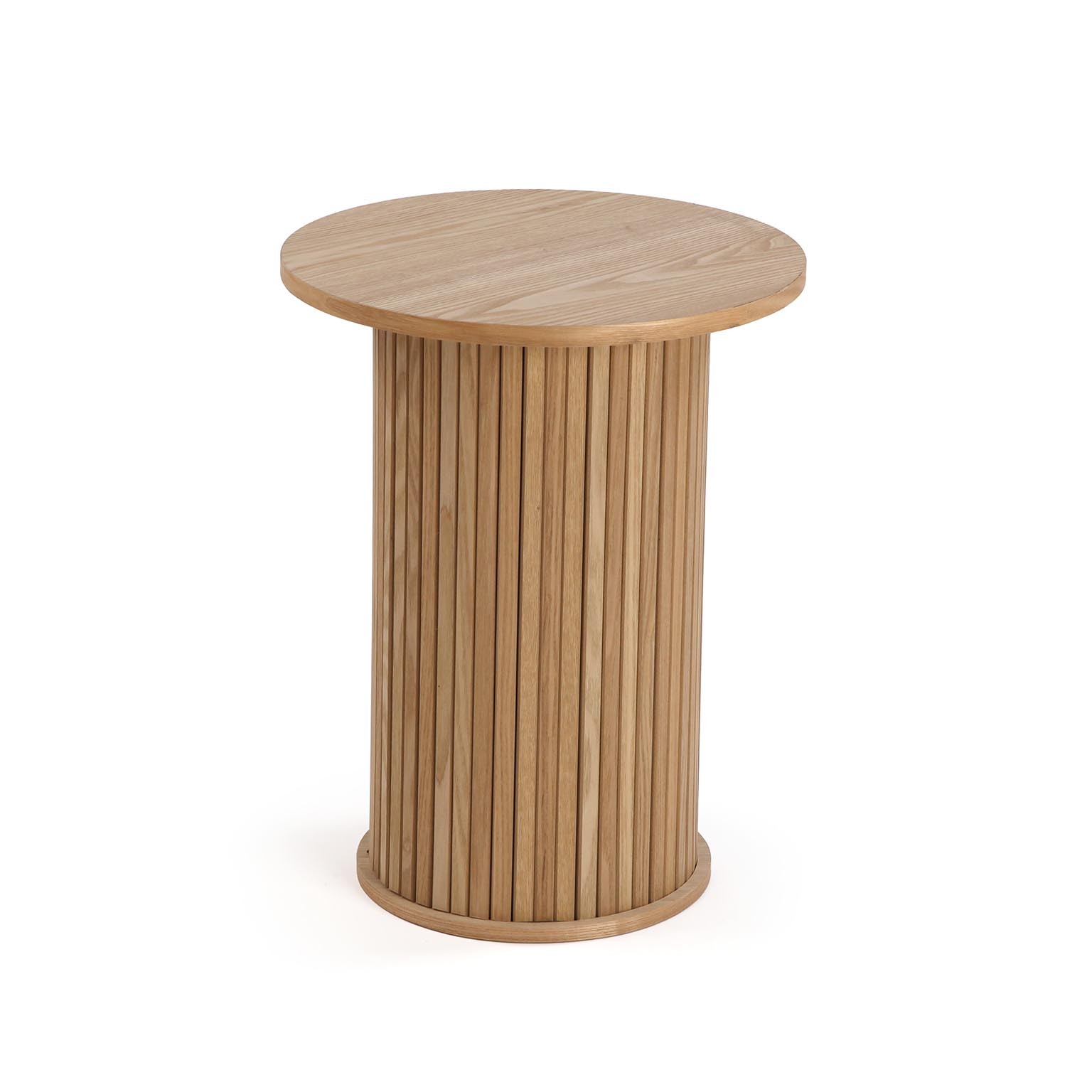 Con un'altezza di 50 cm e un diametro di 40 cm, si integra armoniosamente in soggiorni e salotti, offrendo un supporto pratico per bevande, libri e decorazioni.