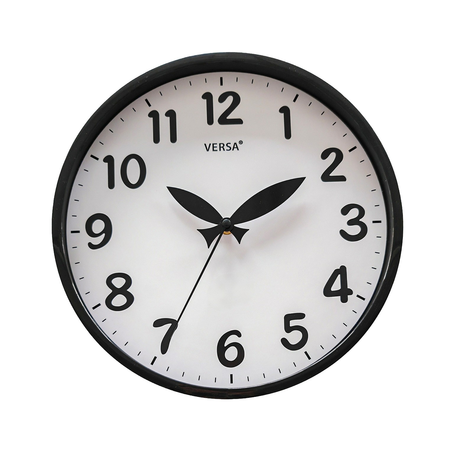 Realizzato in plastica per la cassa e vetro per il quadrante, questo orologio si distingue per il suo elegante contrasto tra il nero della cassa e il bianco del quadrante, con numeri e lancette anch'essi neri.